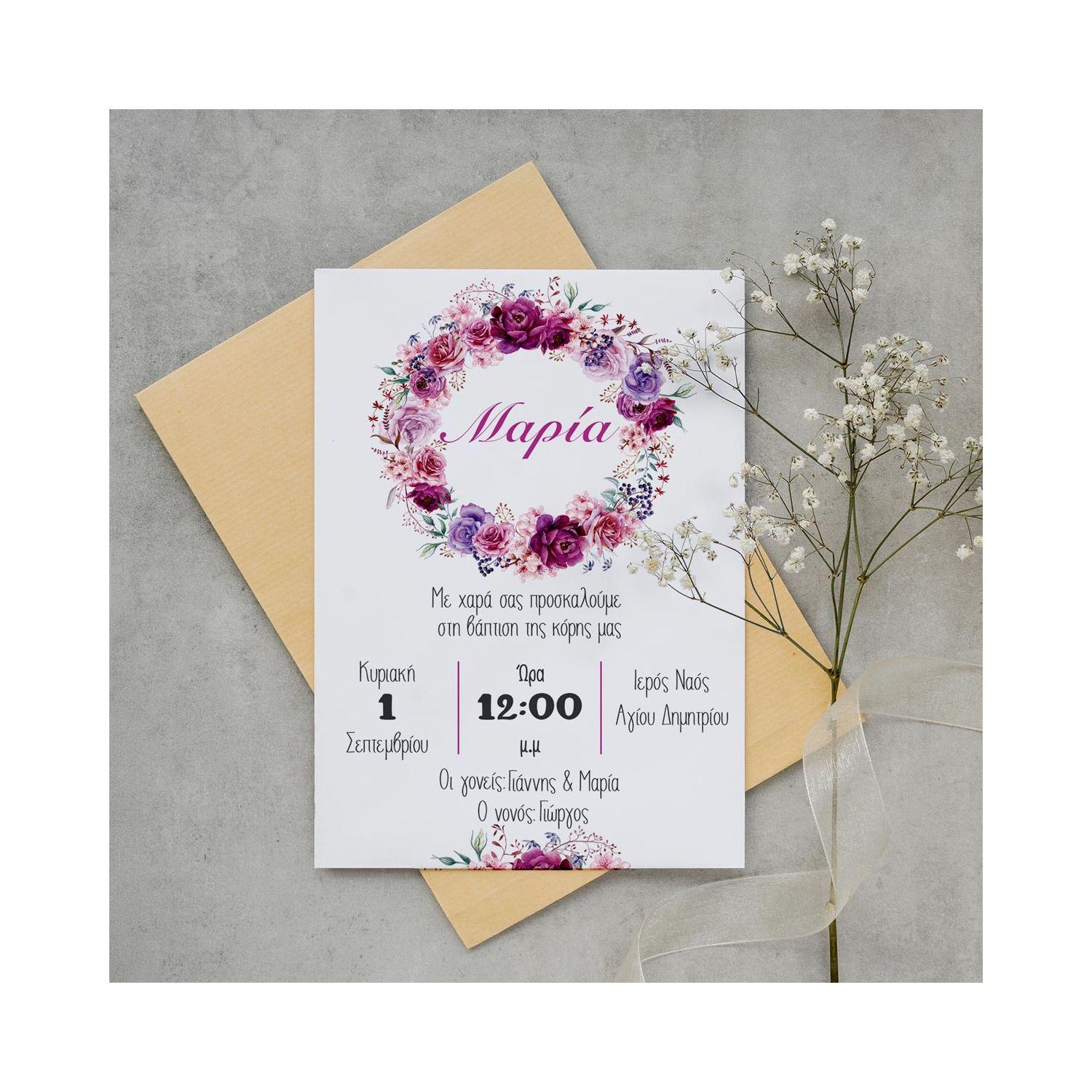 Baptism invitation, Flower wreath with name