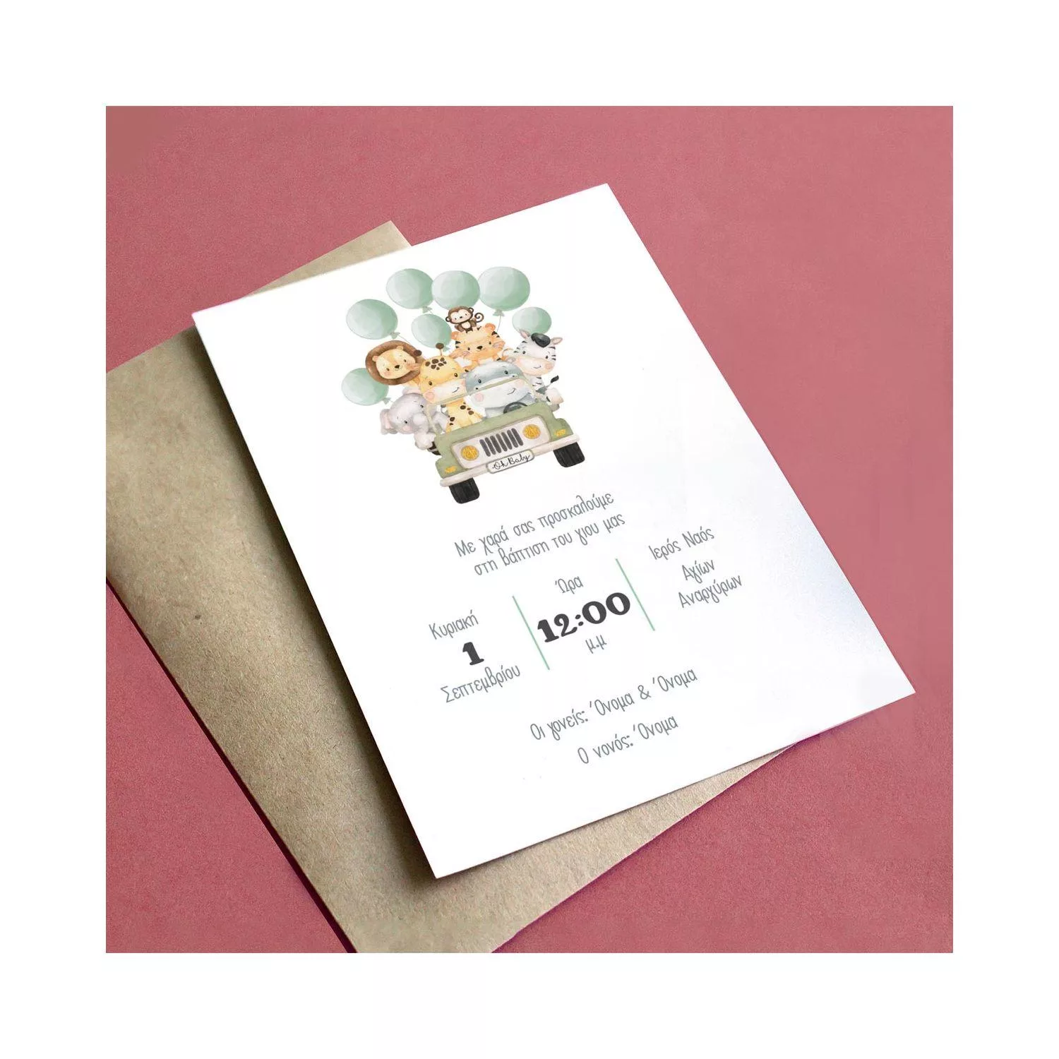 Baptism invitation, Jeep animals balloons