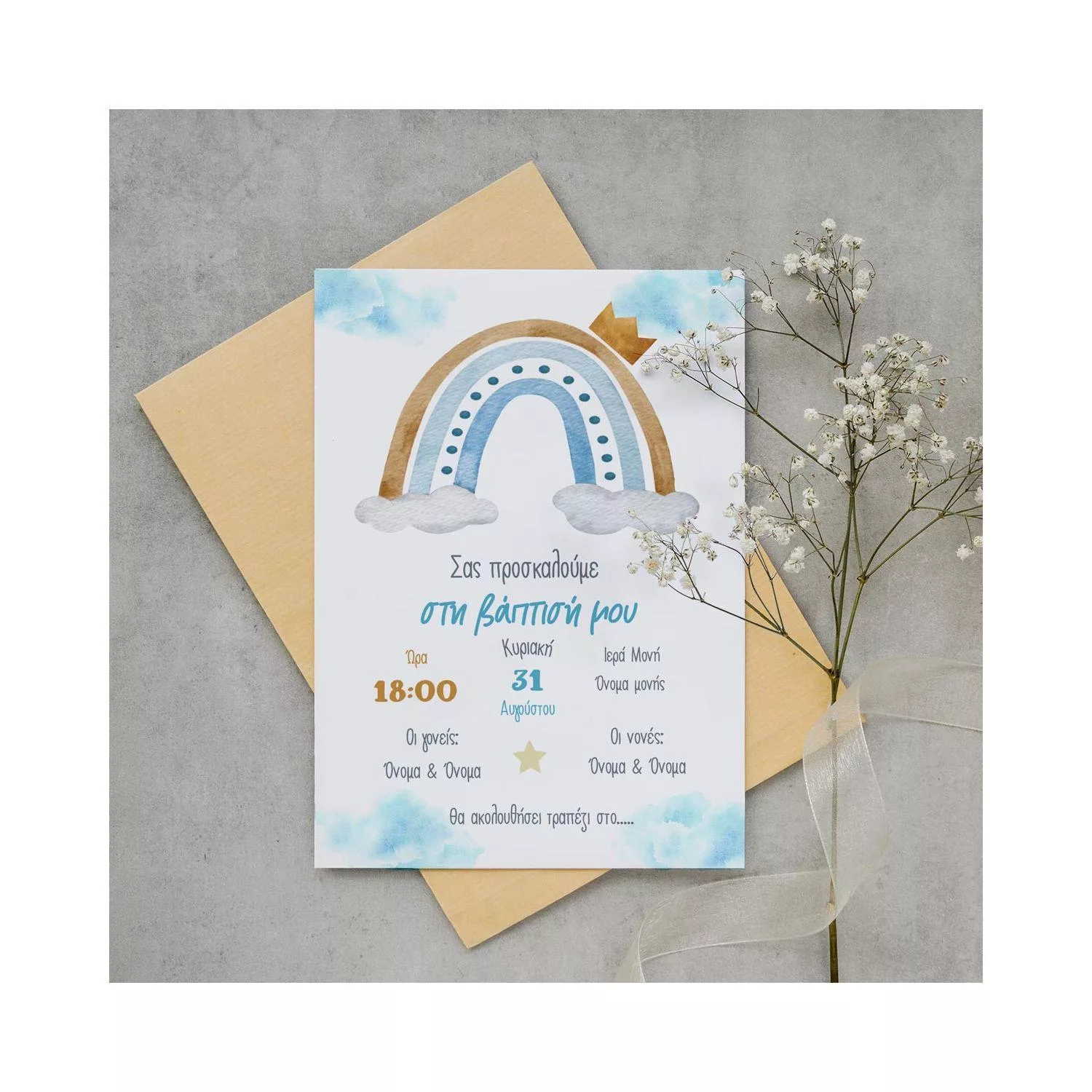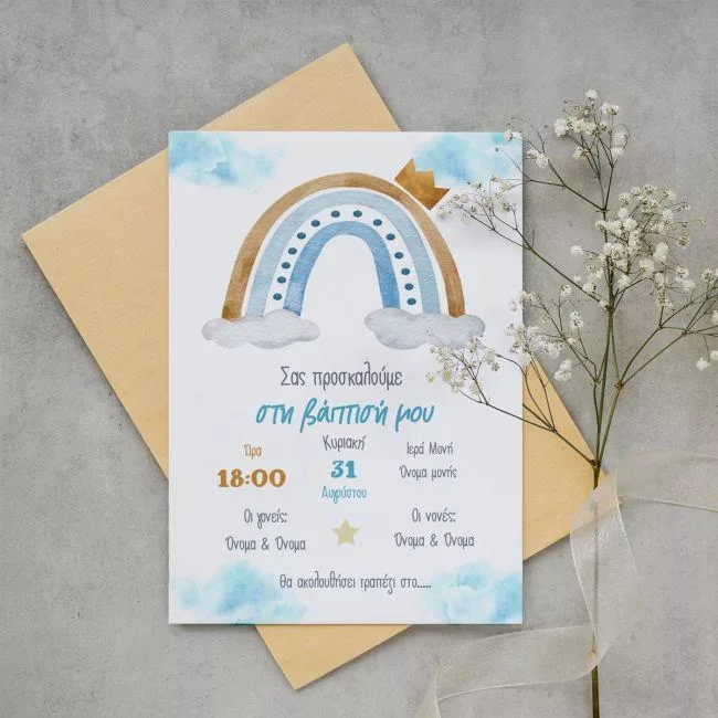 Baptism invitation, Rainbow with clouds and crown boy