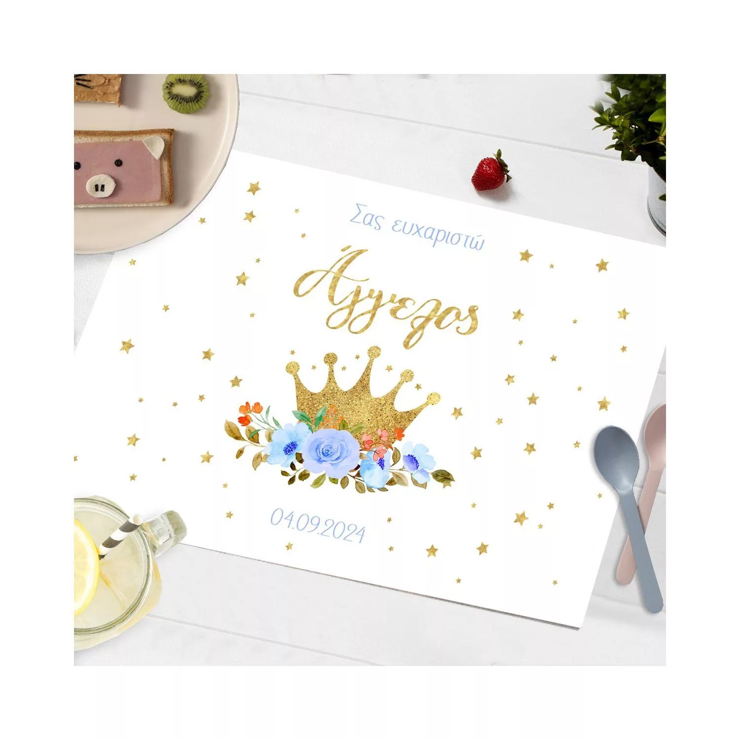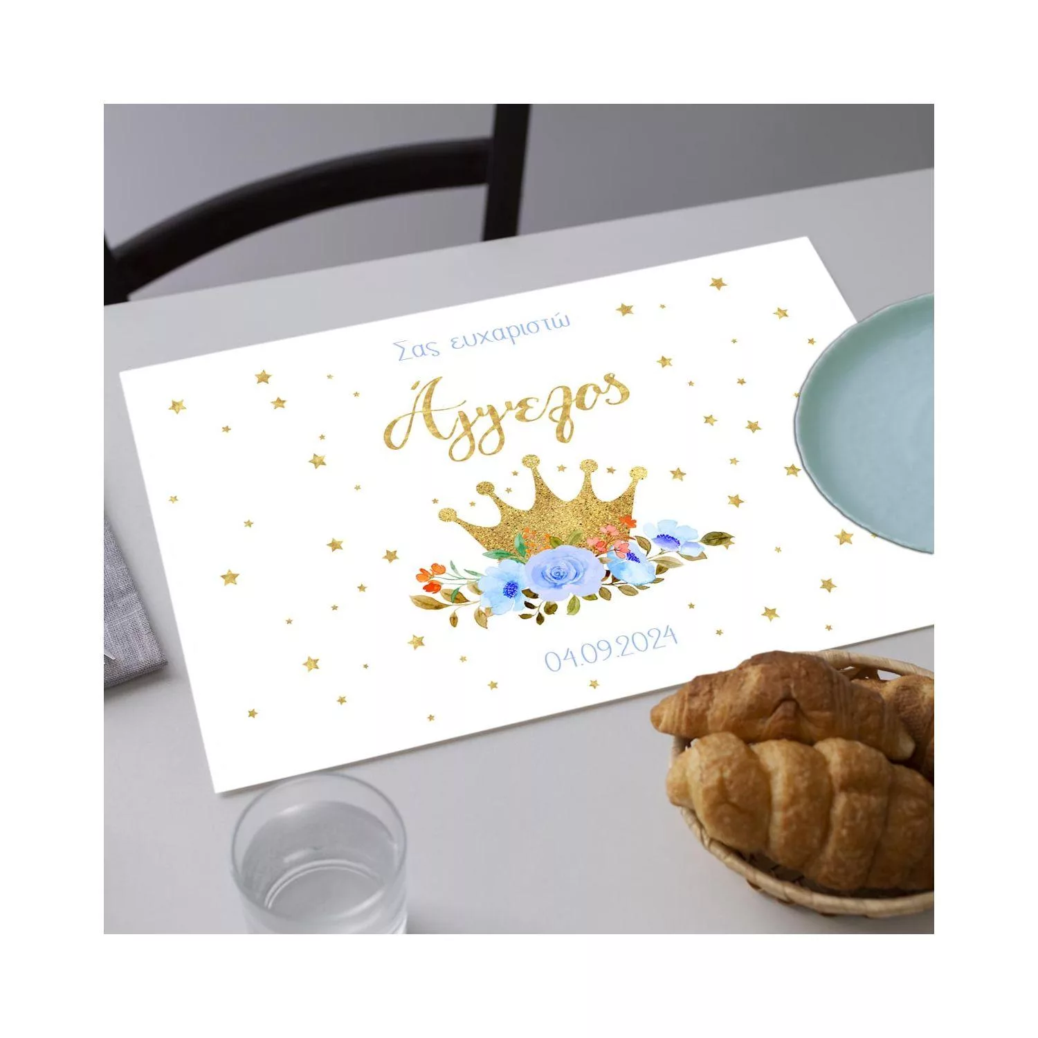 Canvas print Vaptism Golden crown and blue roses