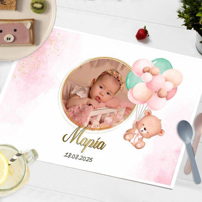Placemat, personalized with photo, bear with balloons pink theme