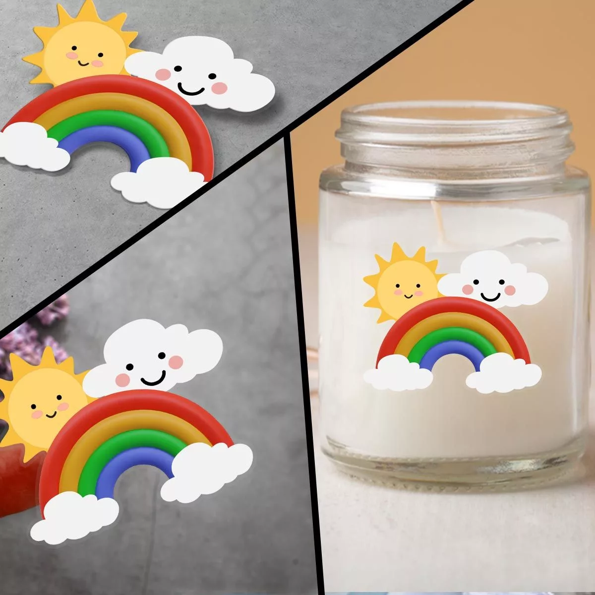 - Features a cheerful Rainbow, Sun, and Cloud design.