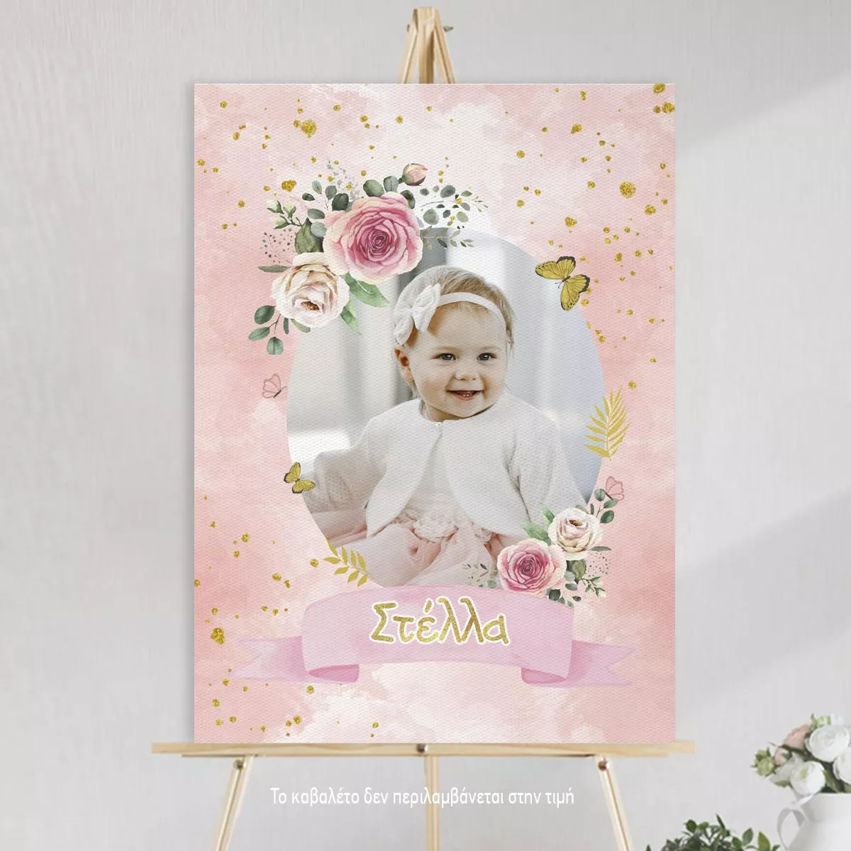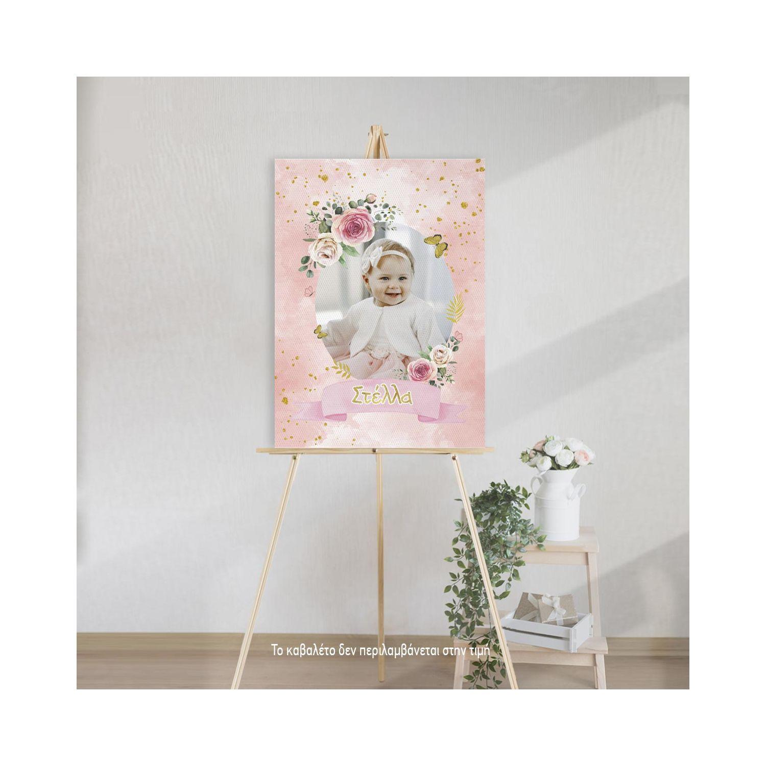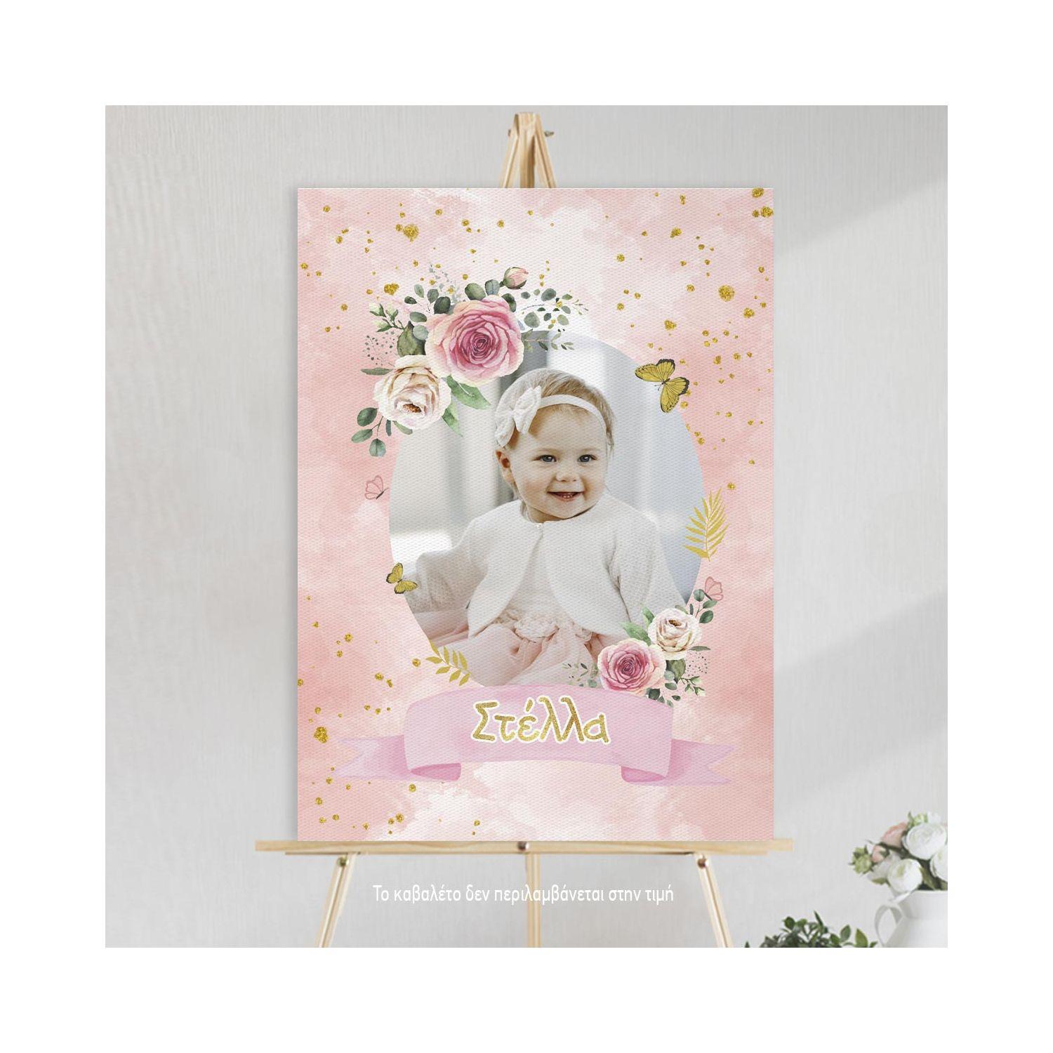 Canvas print baptism, Flowers gold details and photo