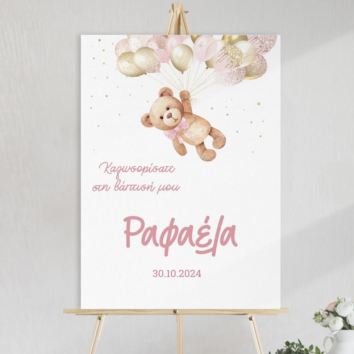 Canvas print welcome to my baptism, Bear with Balloons girly