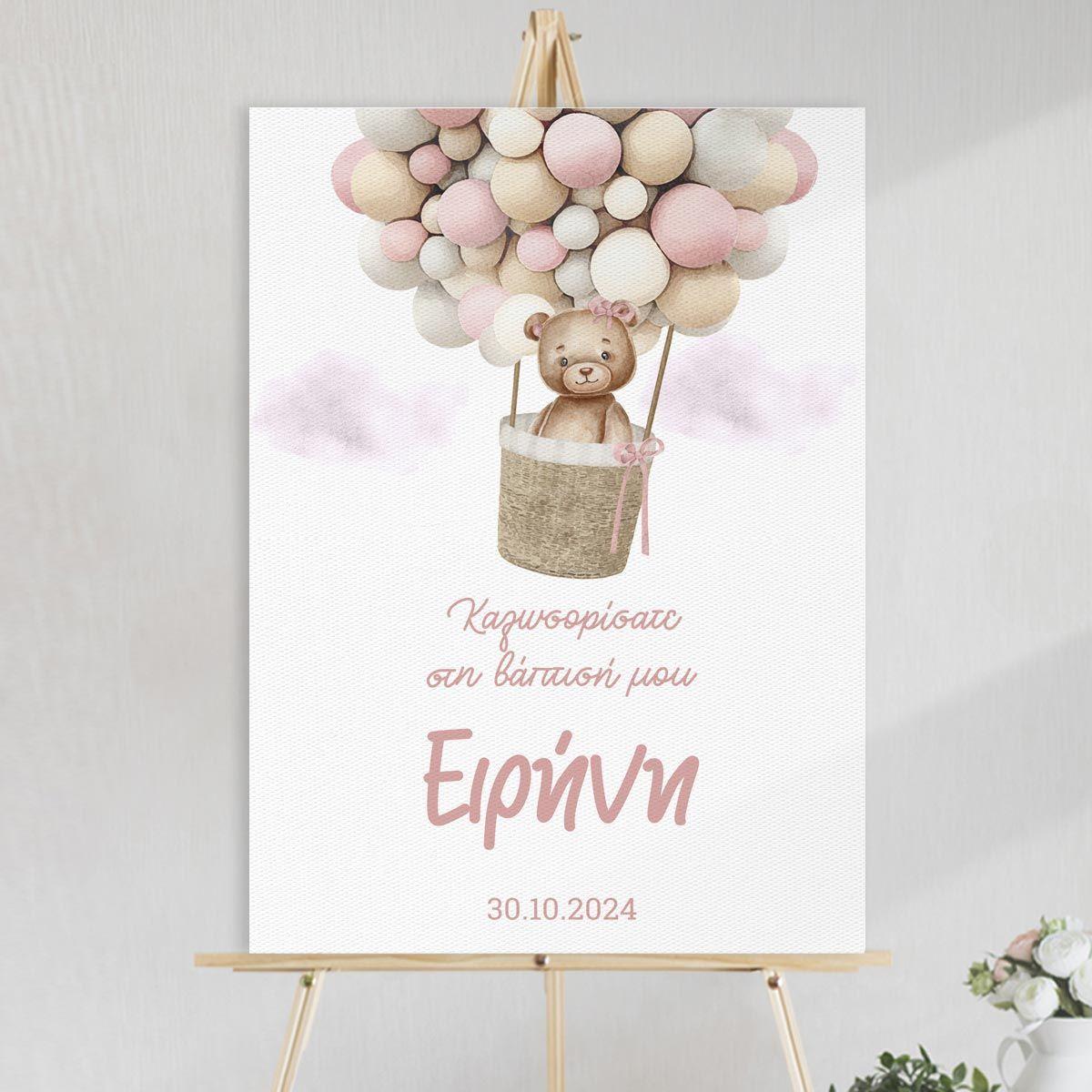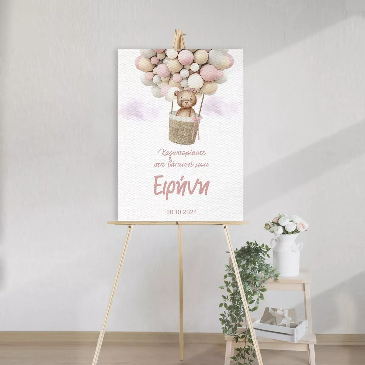 Canvas print welcome to my baptism, Bear with Balloons girly 2