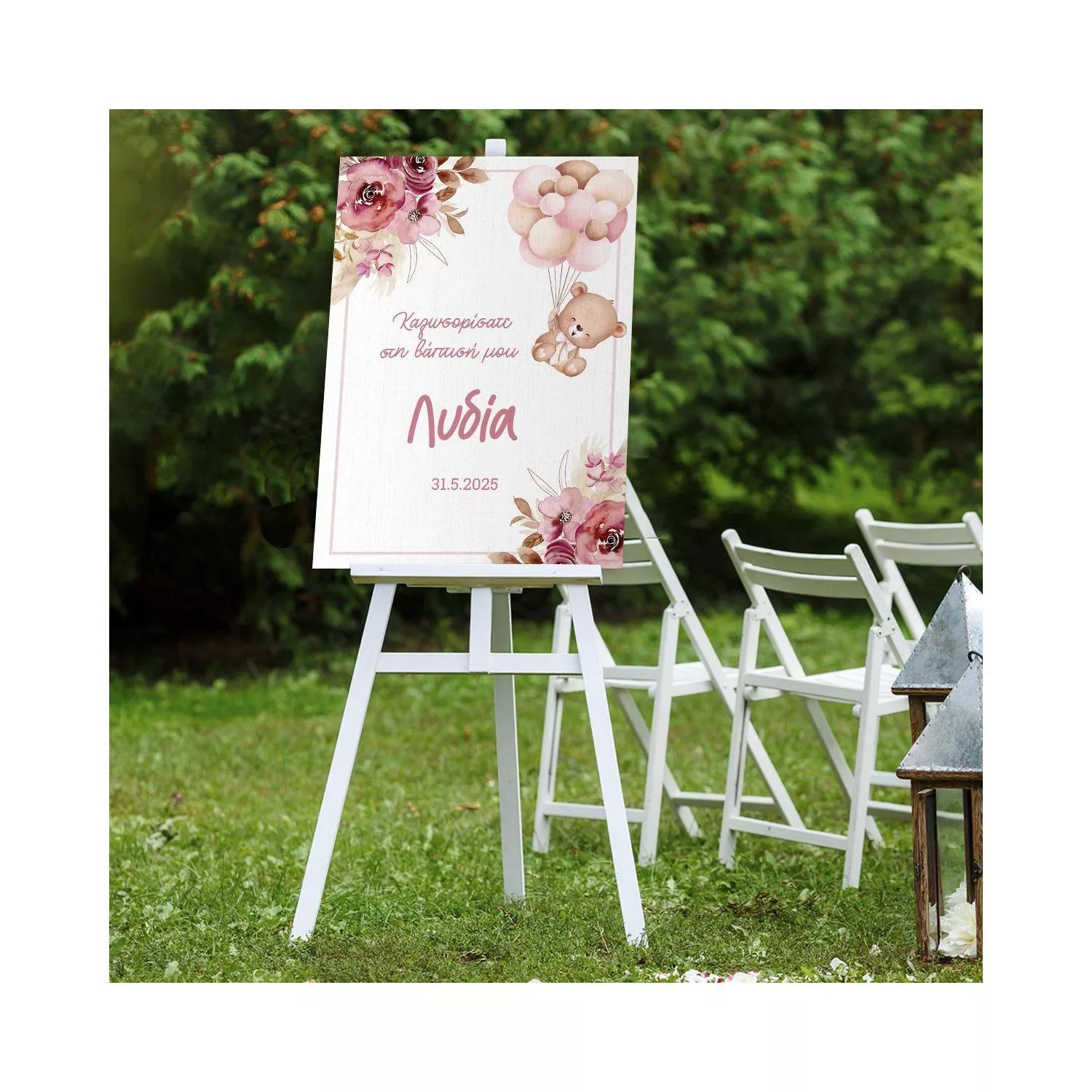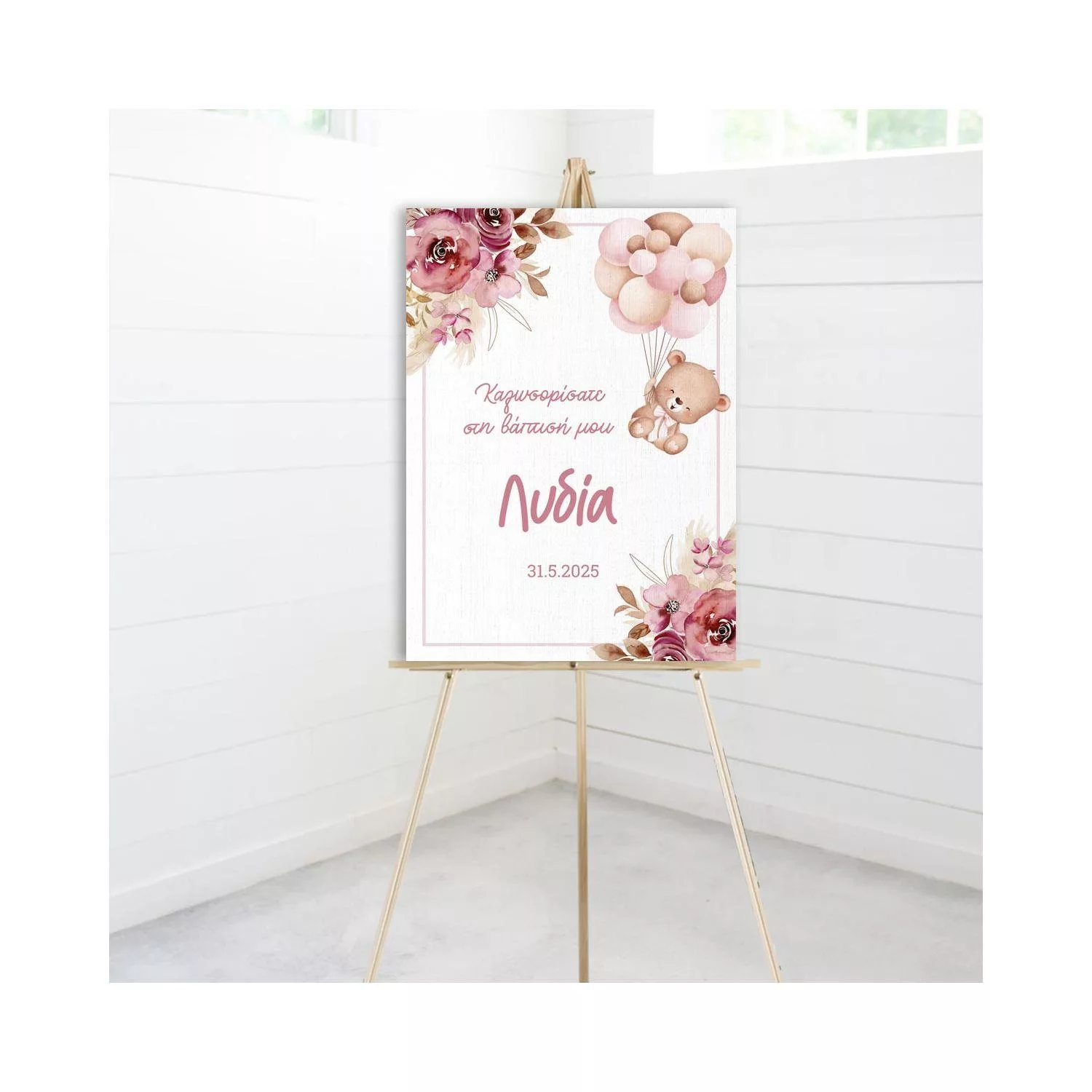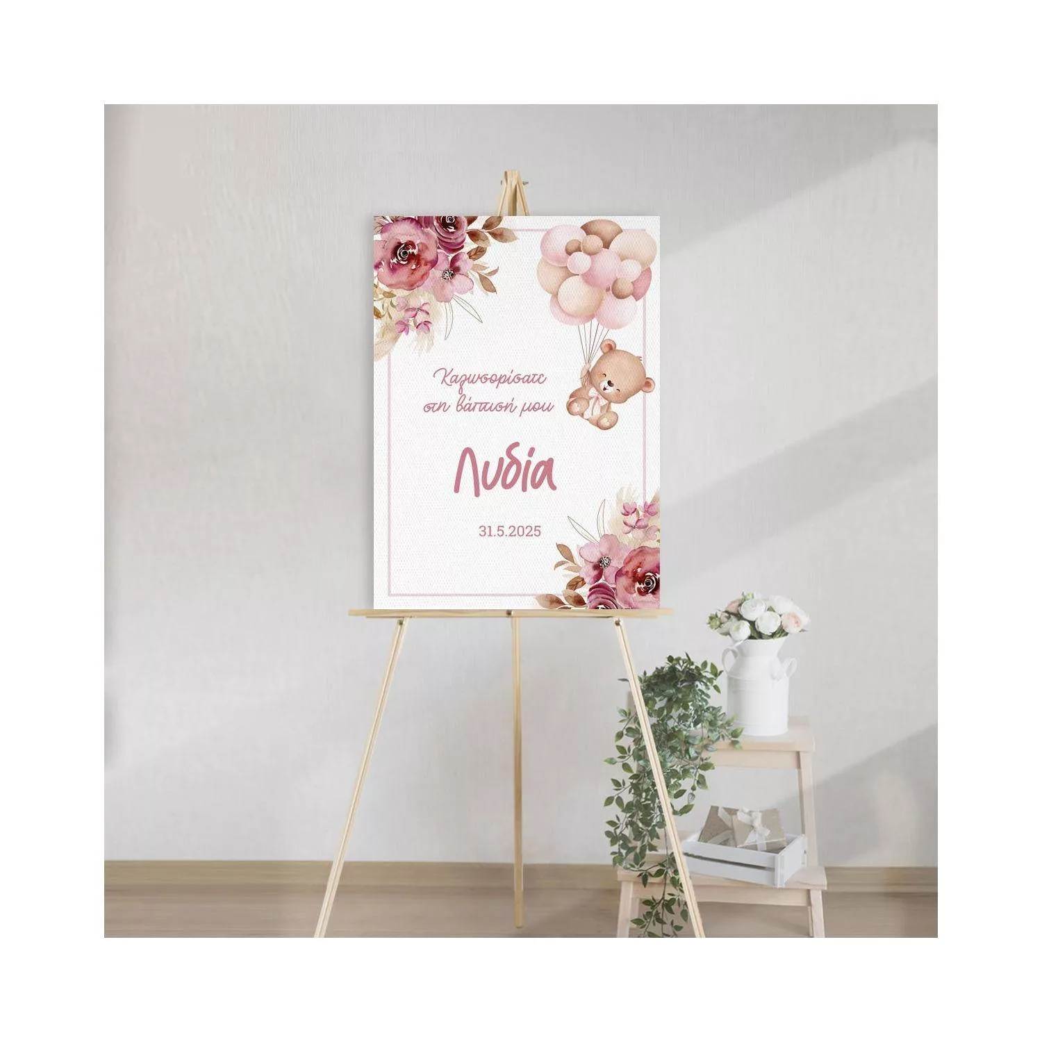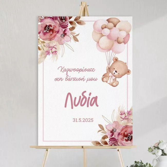Canvas welcome to my baptism, Teddy bear with blue balloons and flowers pink