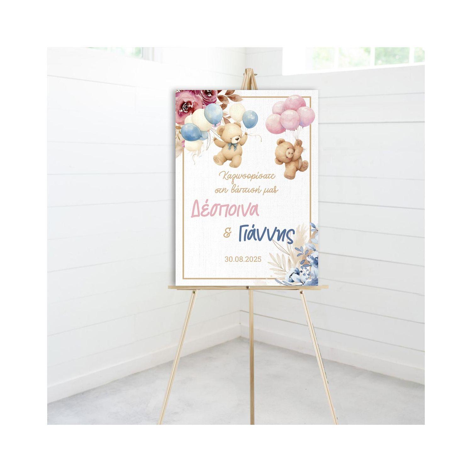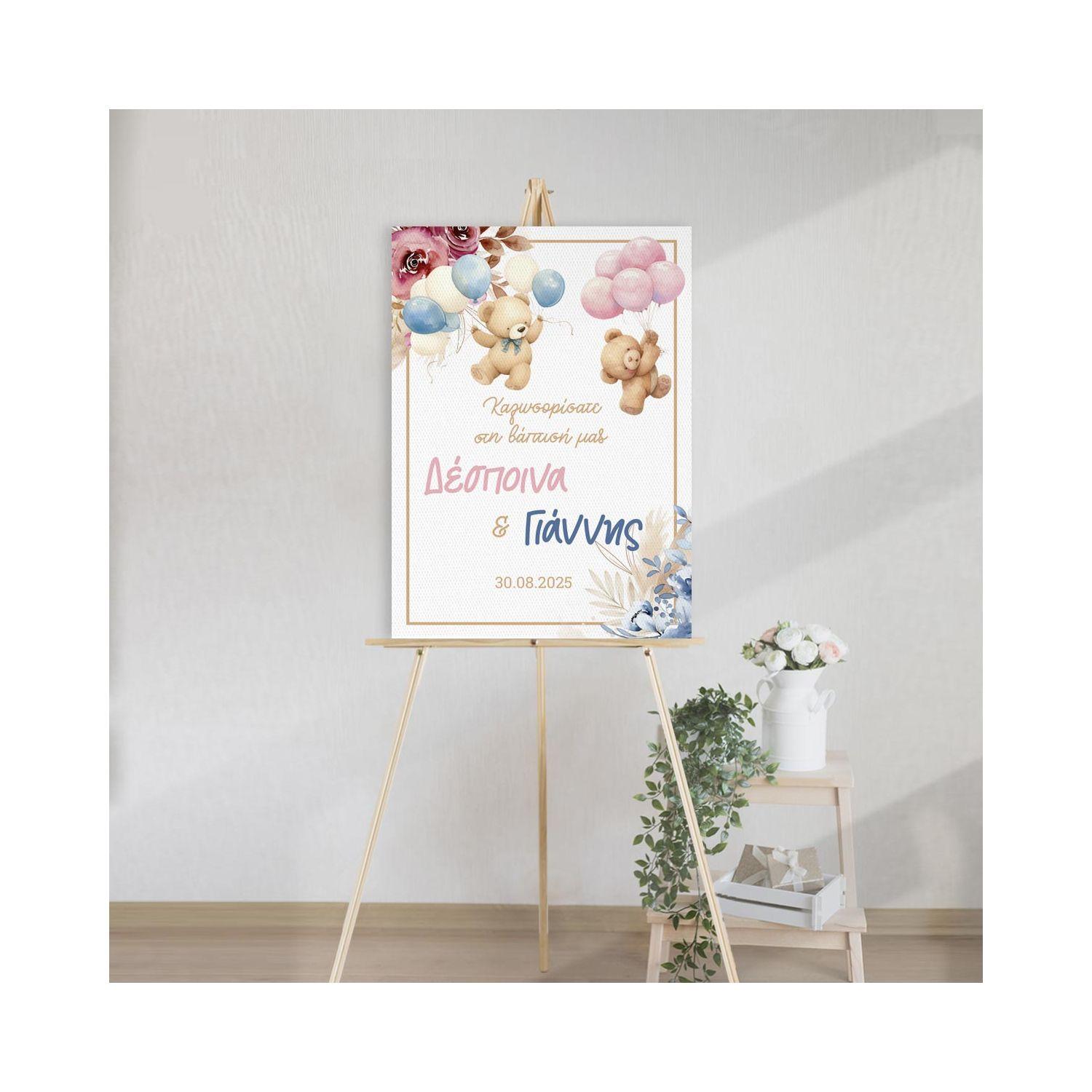 Canvas welcome to my baptism, Twins Teddy bear with blue balloons and flowers