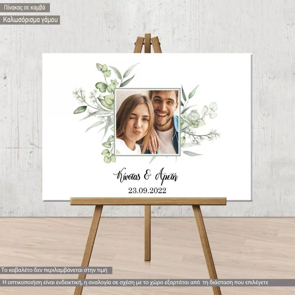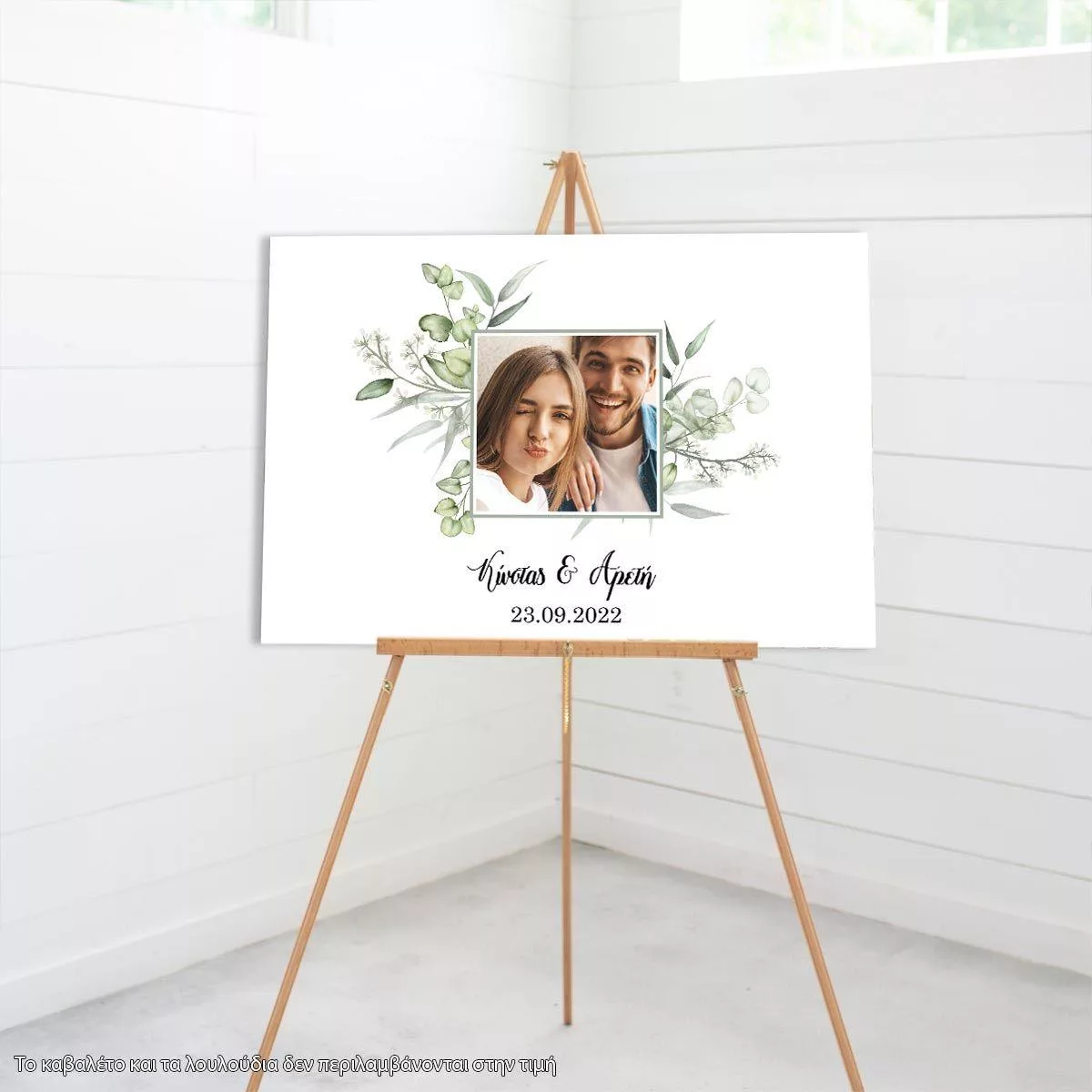 Canvas print Wedding welcome Wishes board Geometric frame, floral blue with photo