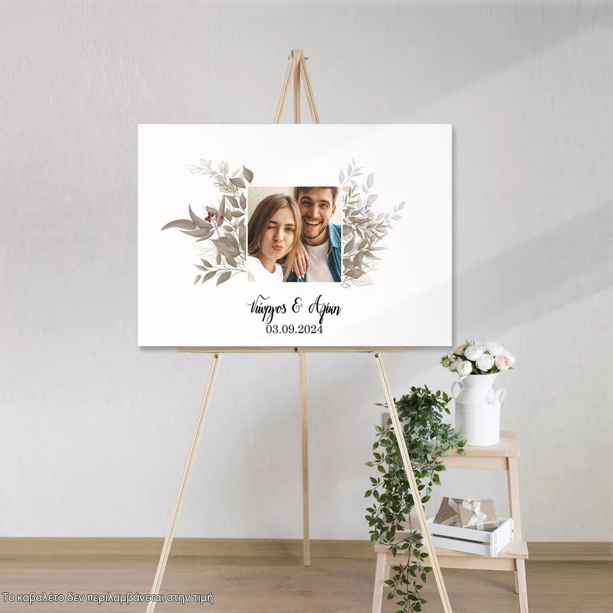 Canvas print Wedding welcome Wishes board Geometric frame, floral blue with photo