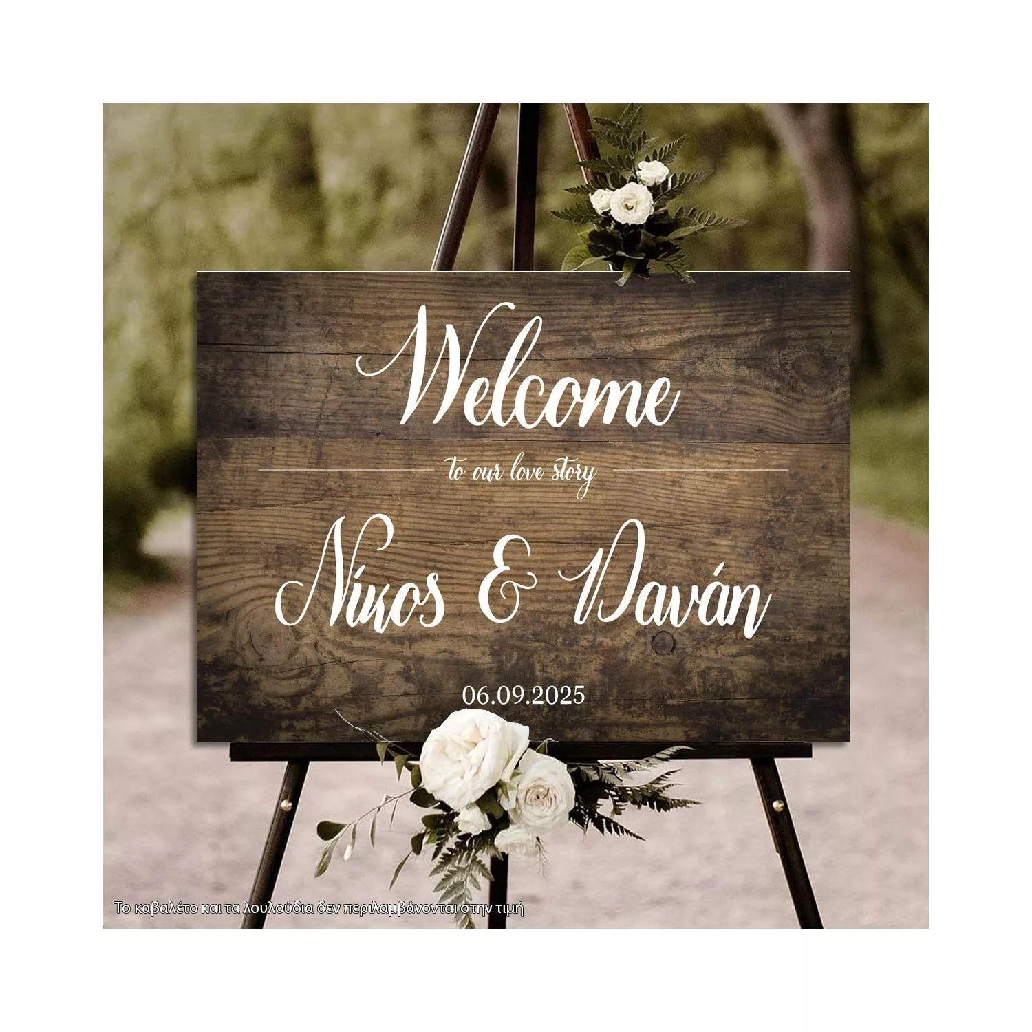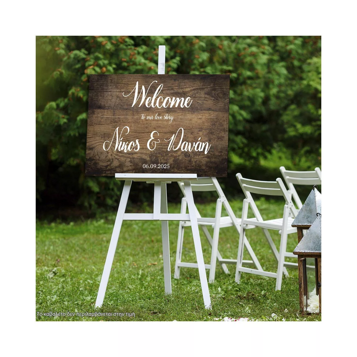 Sign - board, printed on wood, Welcome to our love story