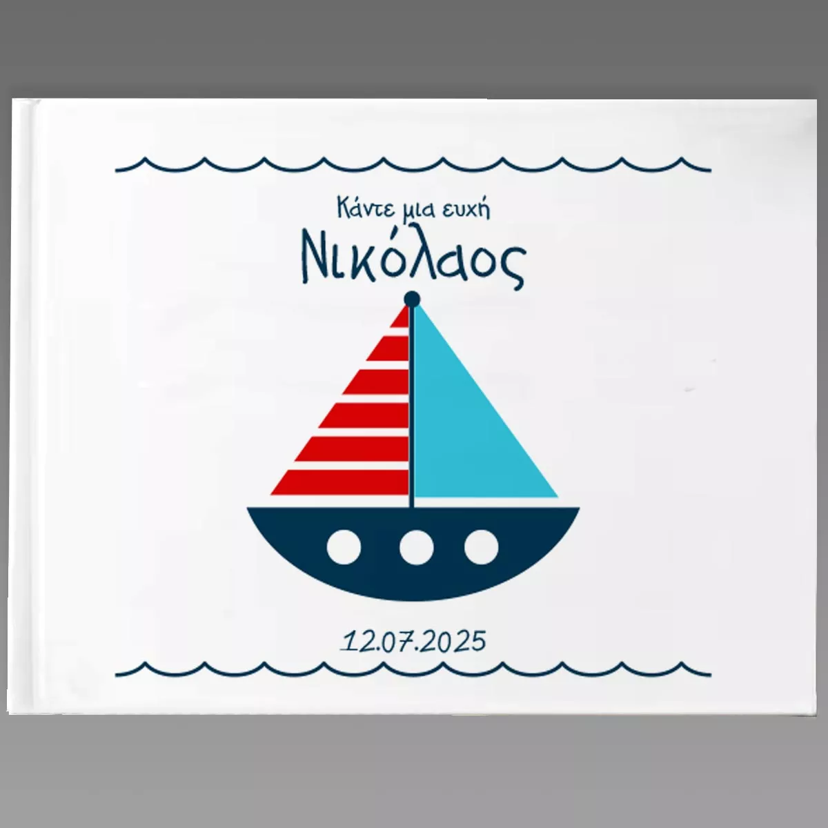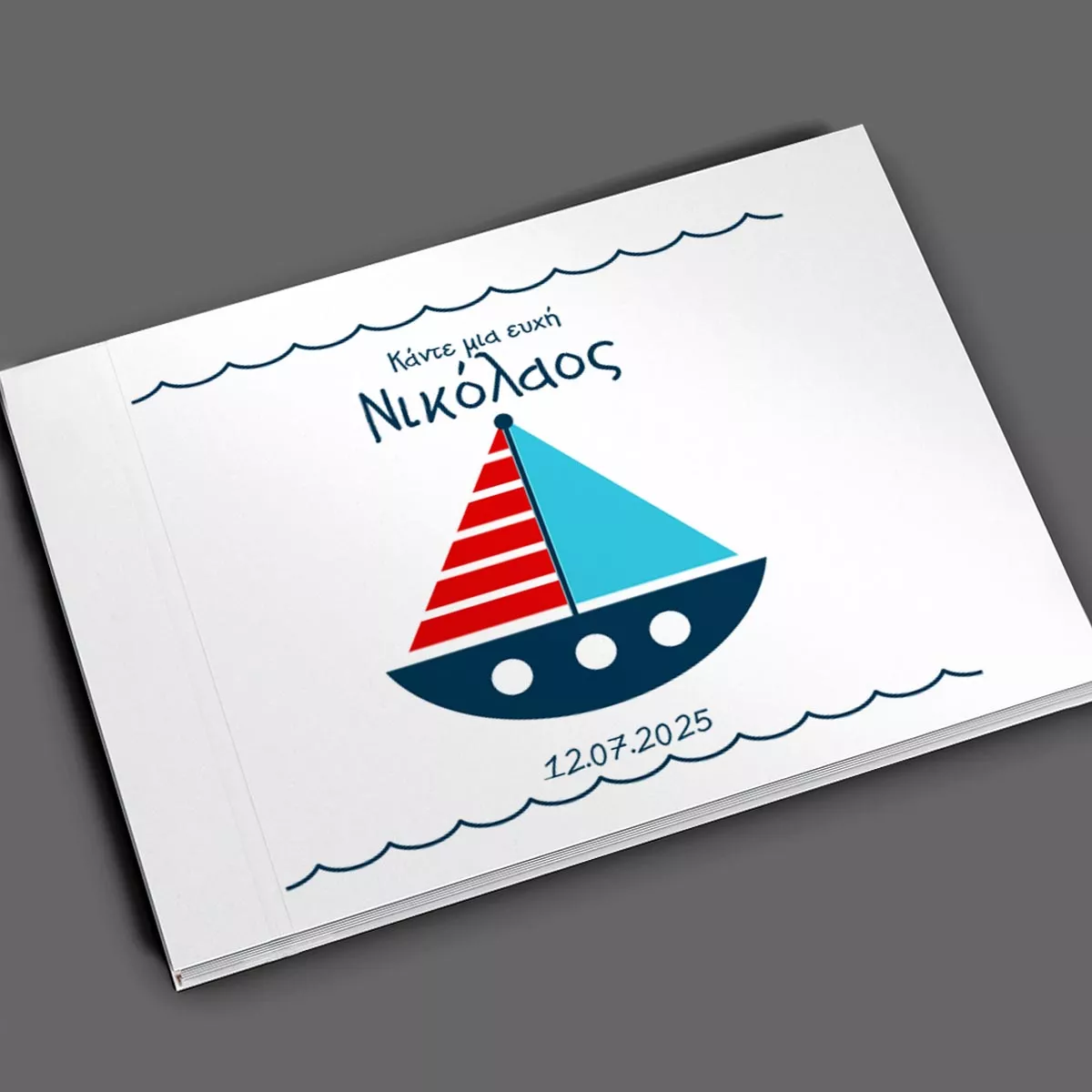 A personalized wish book with the child's name and baptism date. The cover features a minimal, modern boat design, perfect for a boy's sea-themed christening.