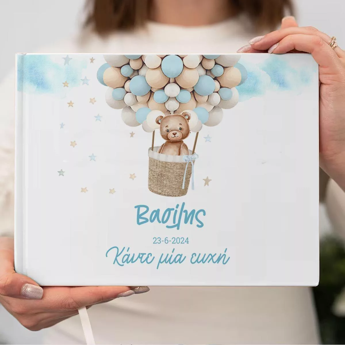 Wishes book, Bear with balloons boy