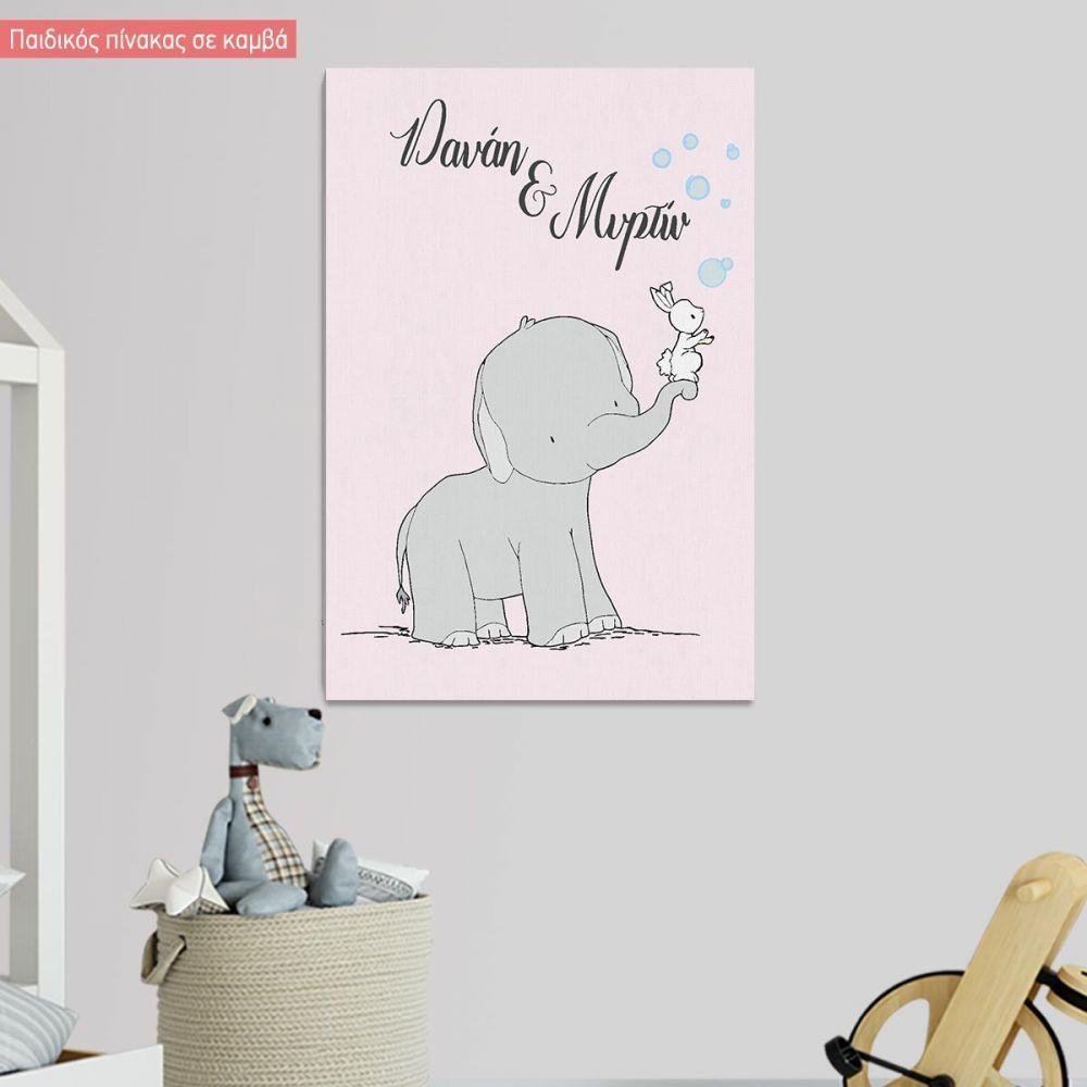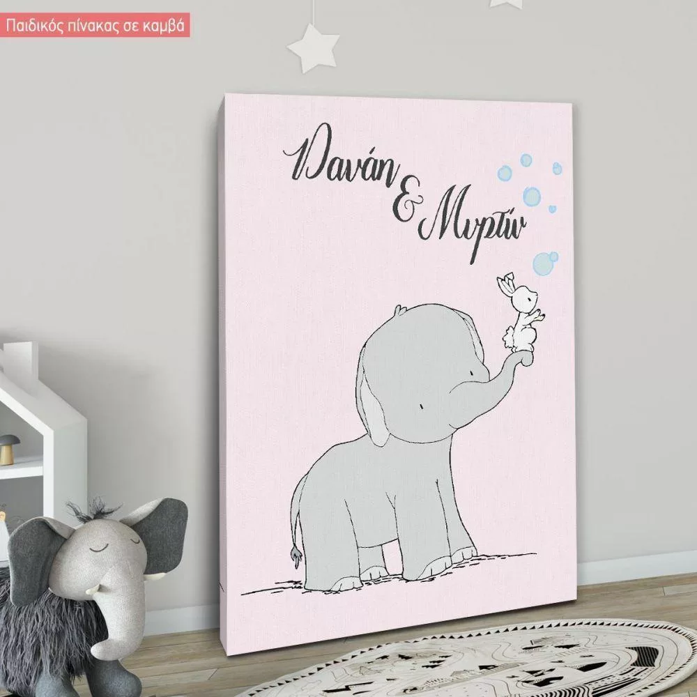 Kids canvas print Siblings, cute elephant and bunny with bubbles