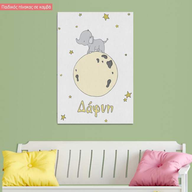 Kids canvas print Cute elephant on the moon with name