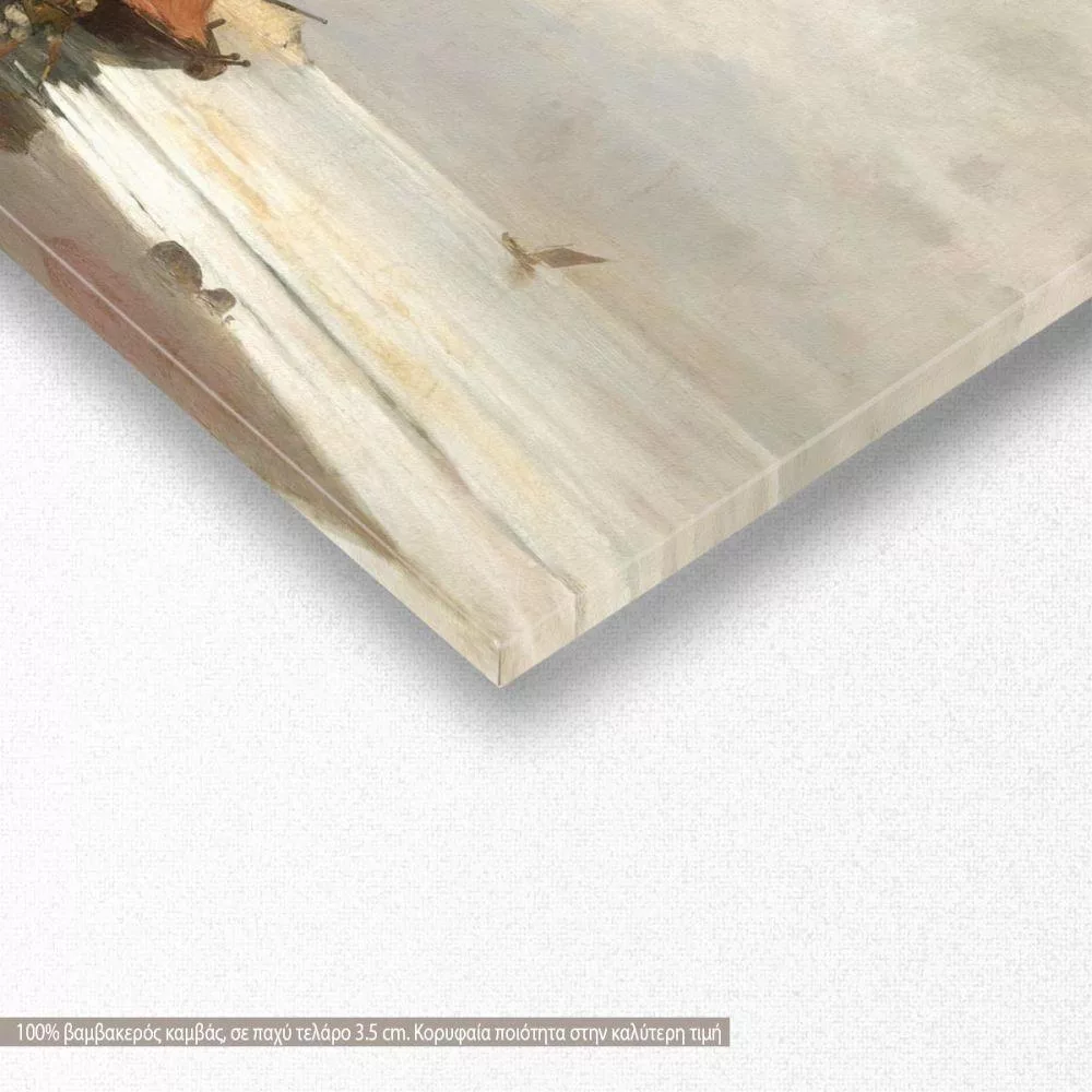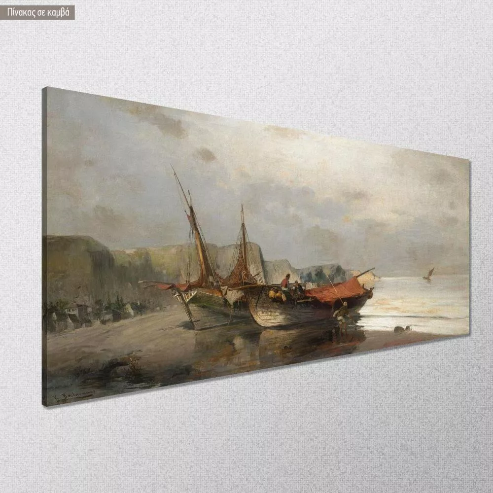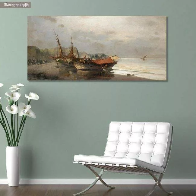 Canvas print Fishing boats along shore, Volanakis panoramic