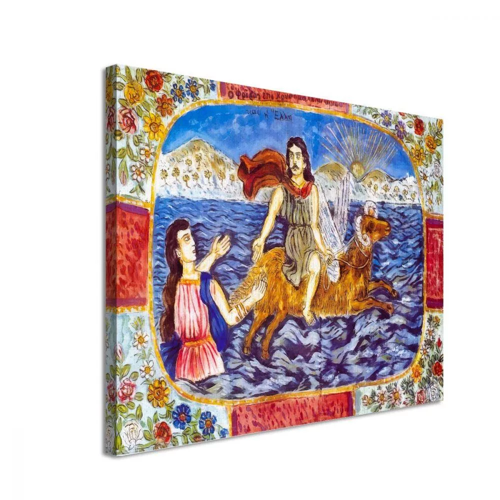 - This painting by Theofilos illustrates a dramatic scene from Greek mythology, where Phrixus and Helle, children of King Athamas and Nephele, are rescued by a golden-fleeced ram. As they fly over the sea, Helle falls and drowns, lending her name to the Hellespont. Theofilos captures the myth with vibrant colors and narrative power, characteristic of his unique art.