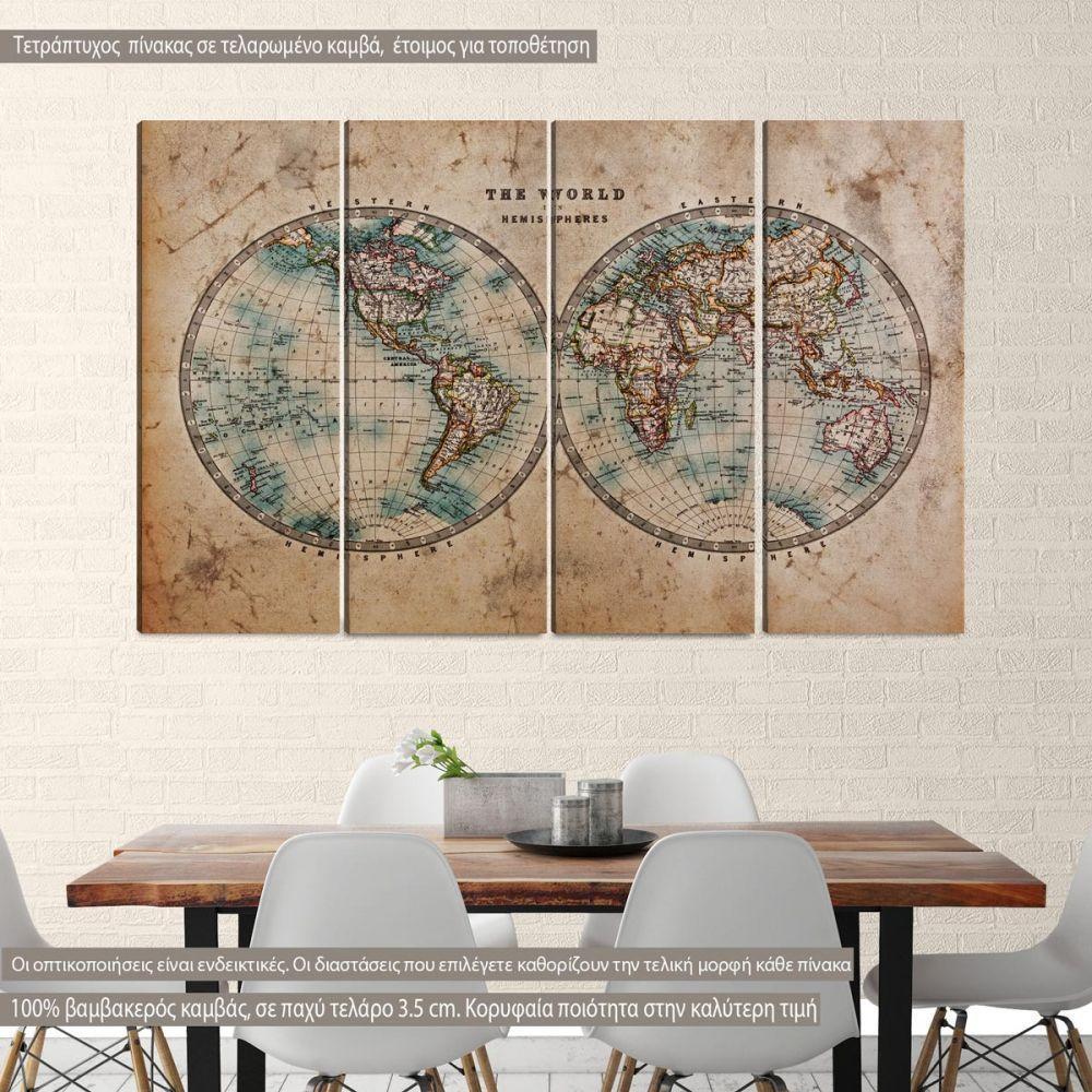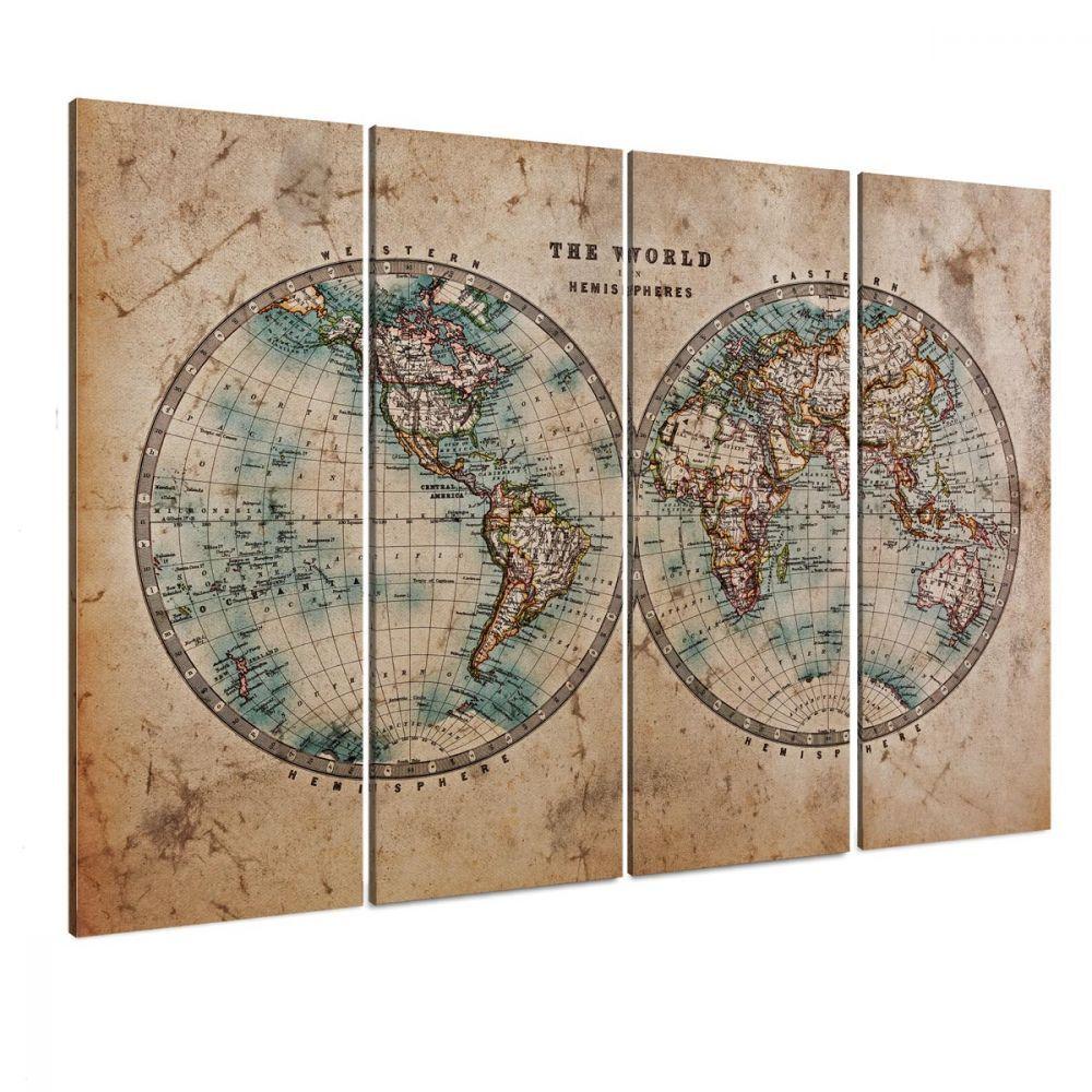 Canvas print Old world map in hemispheres four panels