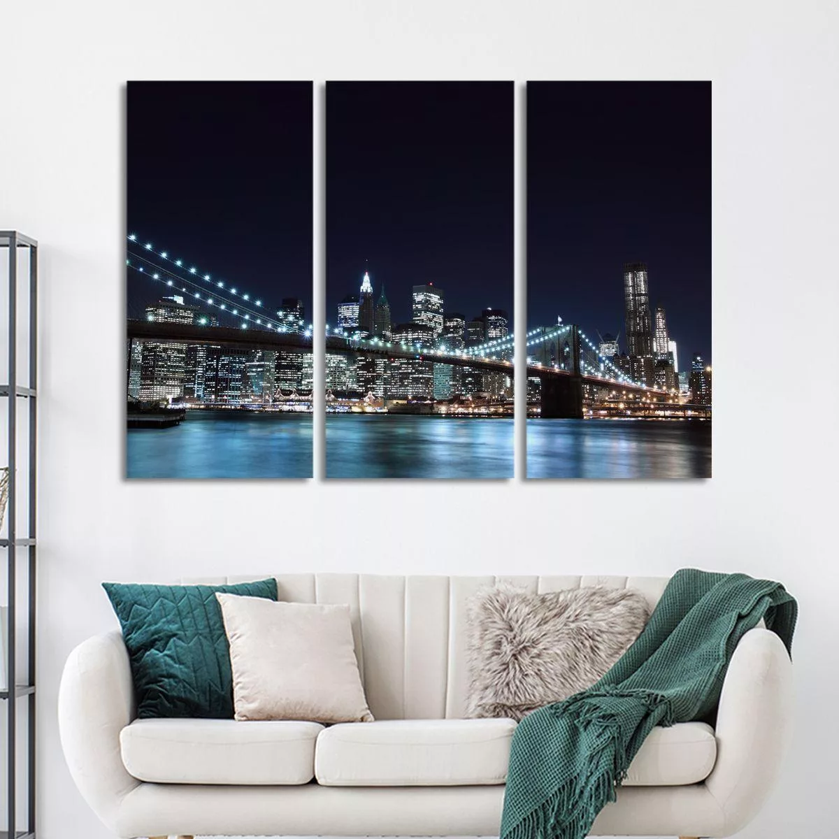 Canvas print Brooklyn bridge dark blue, 3 panels