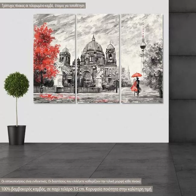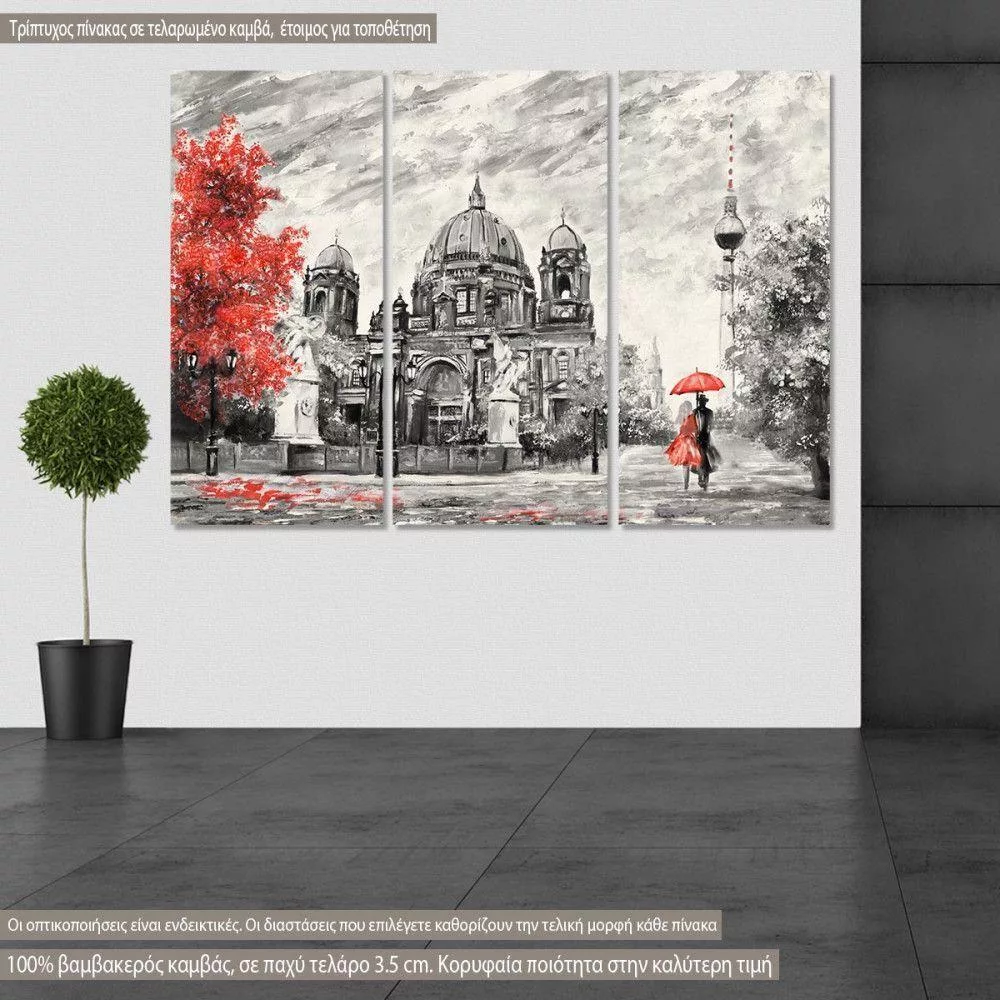 Canvas print Street view of Berlin, red and grayscale, 3 panels