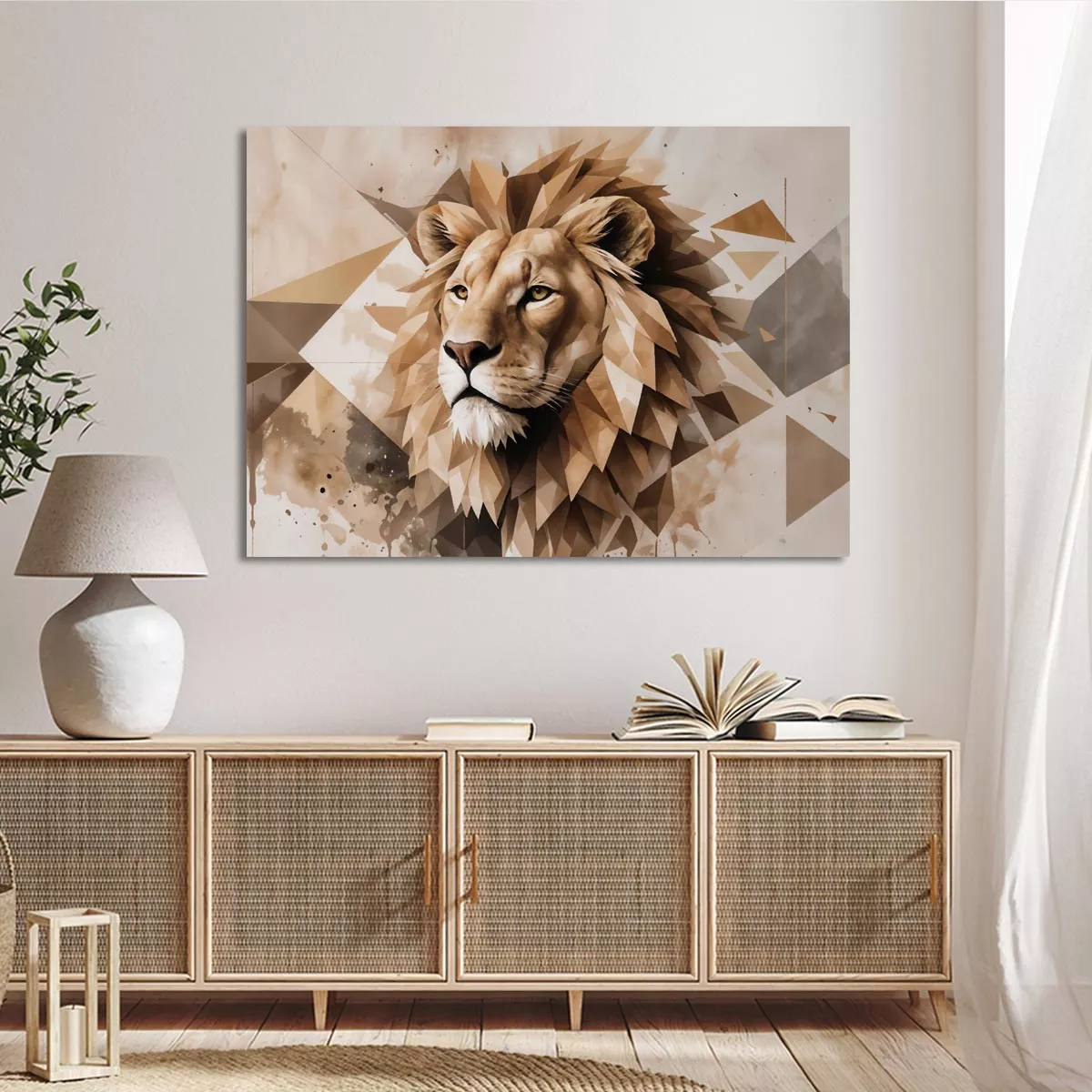 The lion's gaze, a symbol of calm strength, is captured in a uniquely abstract form. This artwork blends geometric precision with wild nature, creating a focal point that commands attention without overwhelming the space.