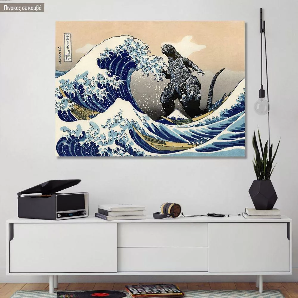 Canvas print Godzilla and the great wave reart, (original Hokusai)