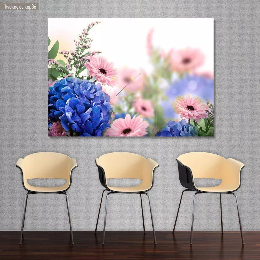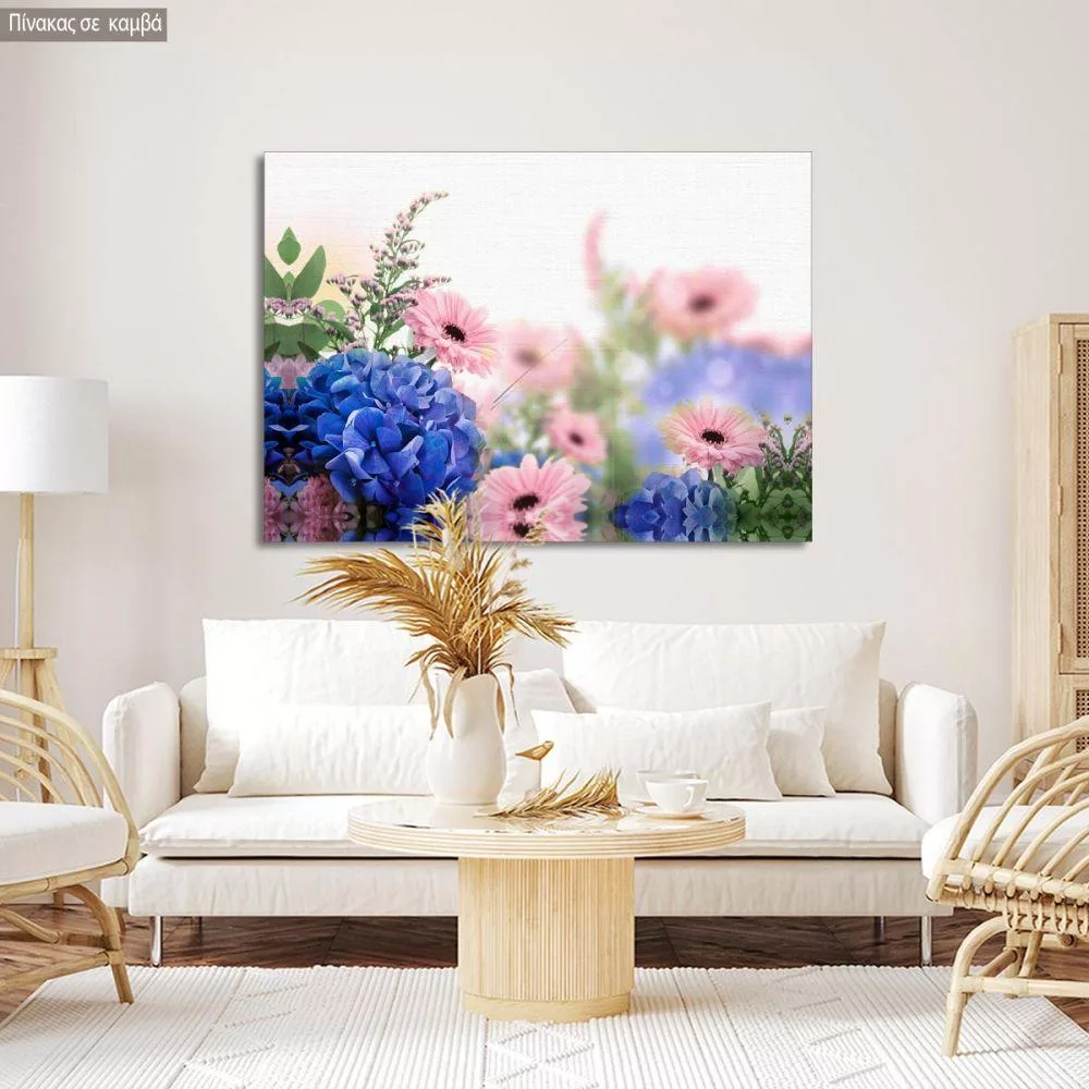 Canvas print Blue hortensias and pink margaritas