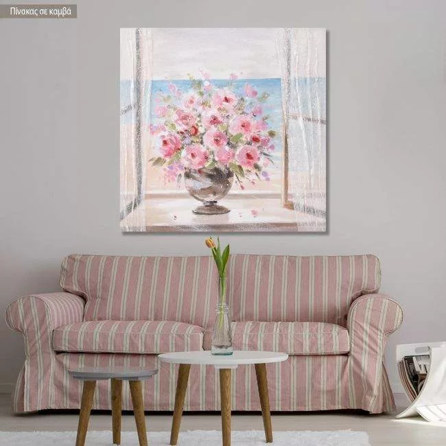 Canvas print Pink roses in a vase by the window
