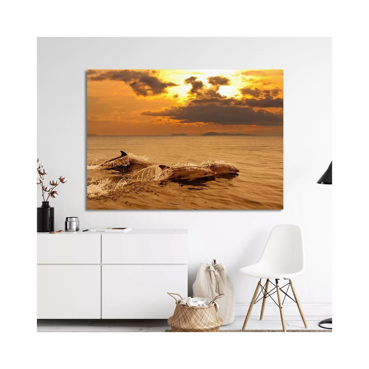 Canvas print Dolphins at sunset