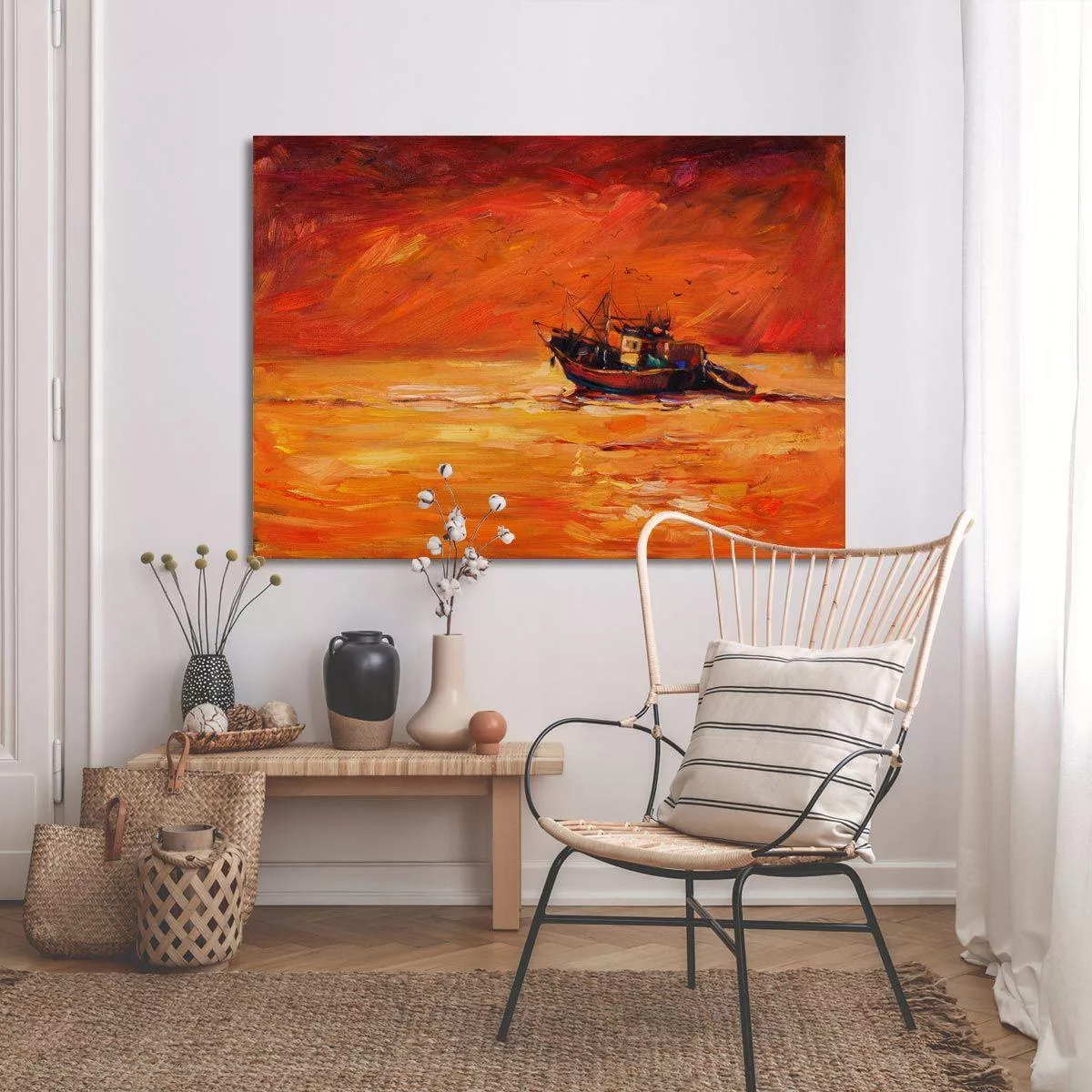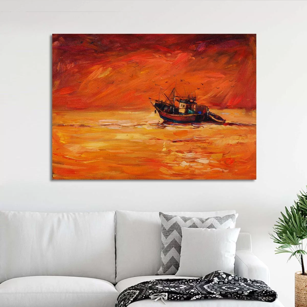 Canvas print Fishing boat at sunset