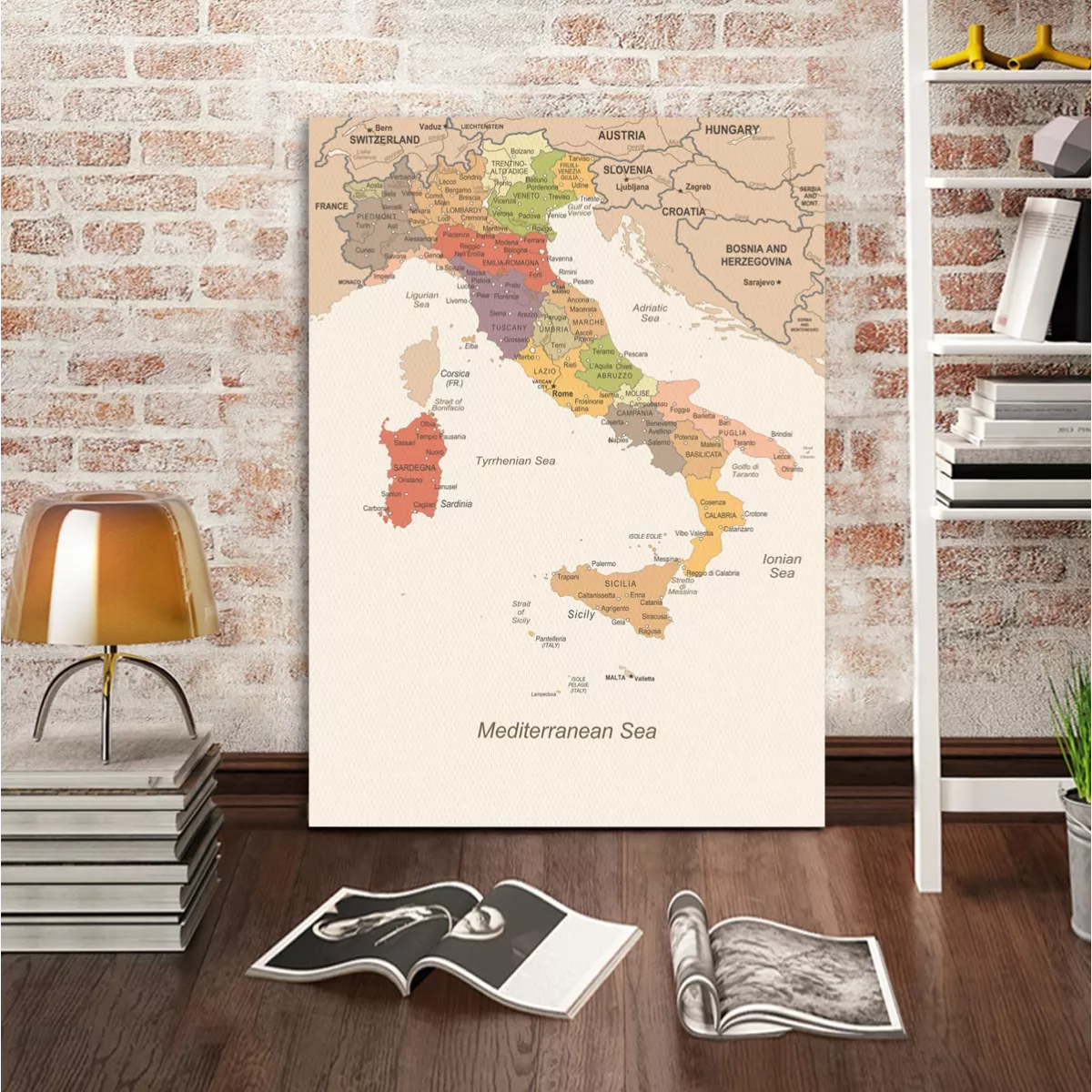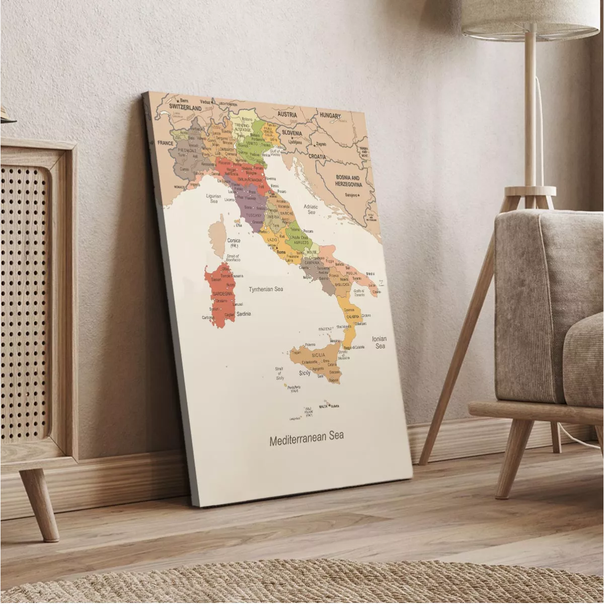 A decorative map of Italy in earthy tones that brings a sense of travel and classic aesthetics to your space.
