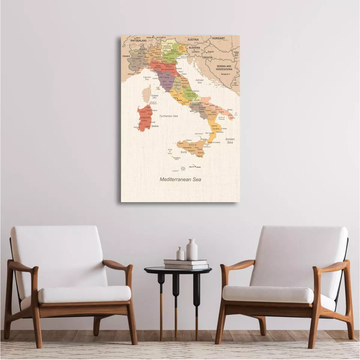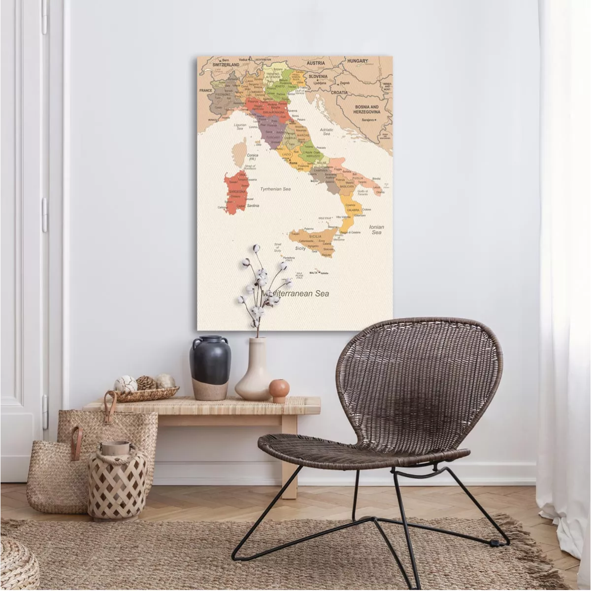The map of Italy is rendered with a vintage aesthetic and clean lines, creating a focal point that blends geography with art. An ideal choice for those who love travel and minimal aesthetics, offering a subtle, elegant touch to your wall.