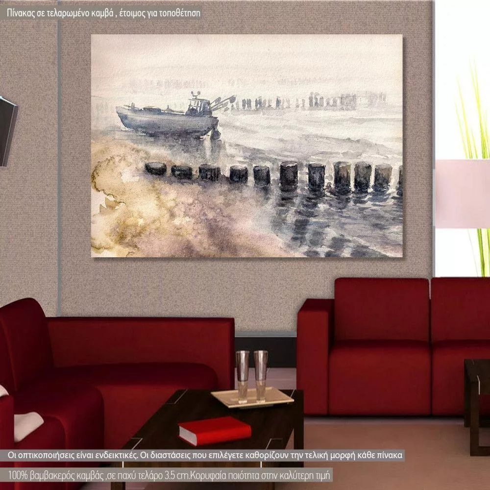 Canvas print Fishing boat moored during fog