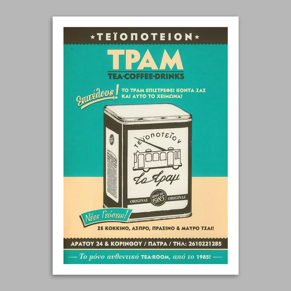 - Reproduces the historic advertisement of Patras' "only authentic TEA-ROOM" from 1985.