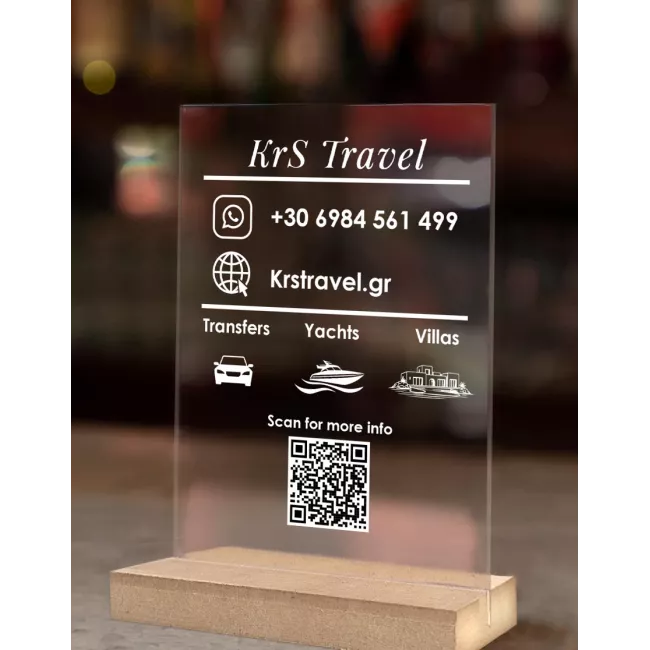 An elegant tabletop sign made of clear plexiglass, fully personalized with your business details, logo, and unique QR code.