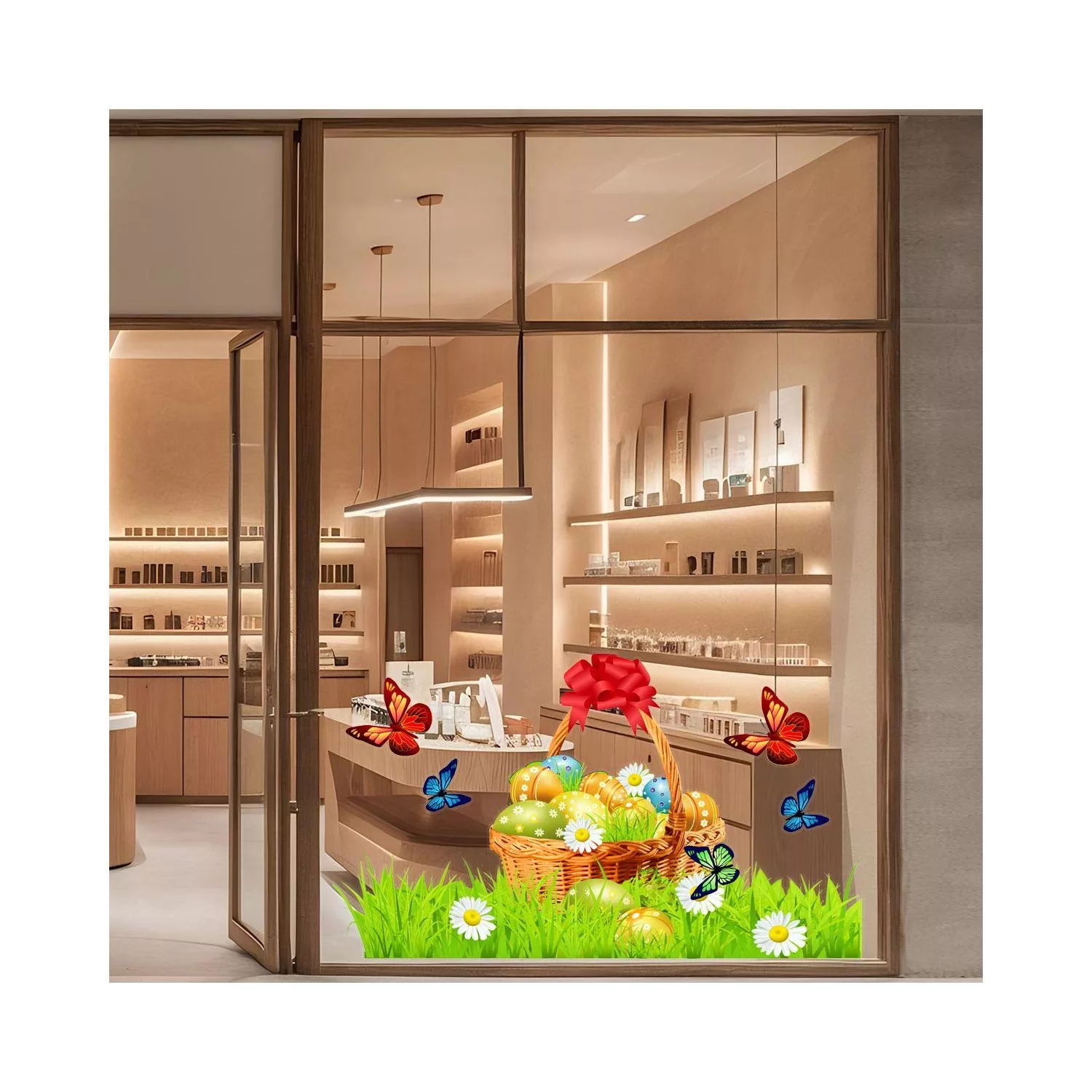 Easter basket window sticker for seasonal shop decoration. Durable vinyl for professional displays.