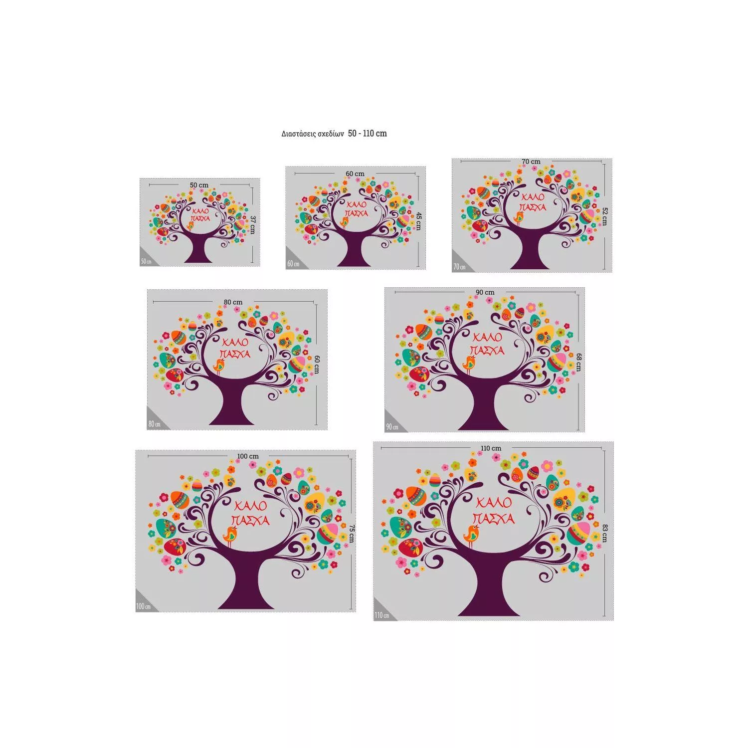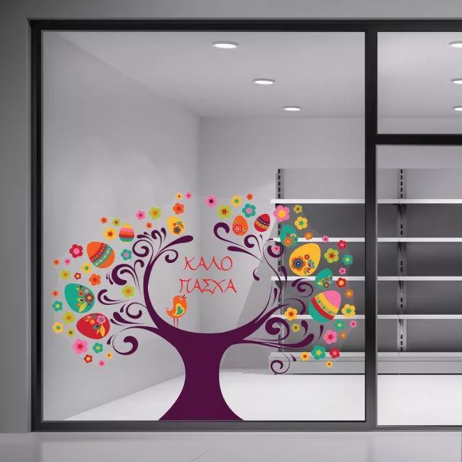 Upgrade your store's festive look with the Easter sticker with Easter tree, colorful eggs. An ideal decorative element for shop windows and interior spaces that adds color and vibrancy.