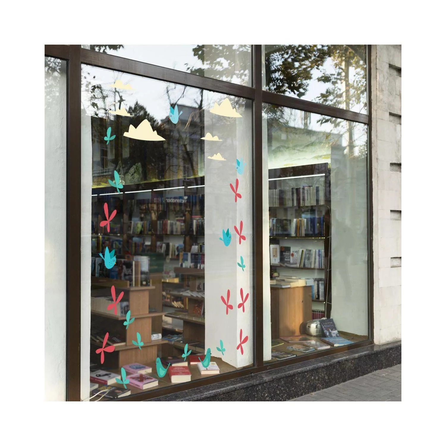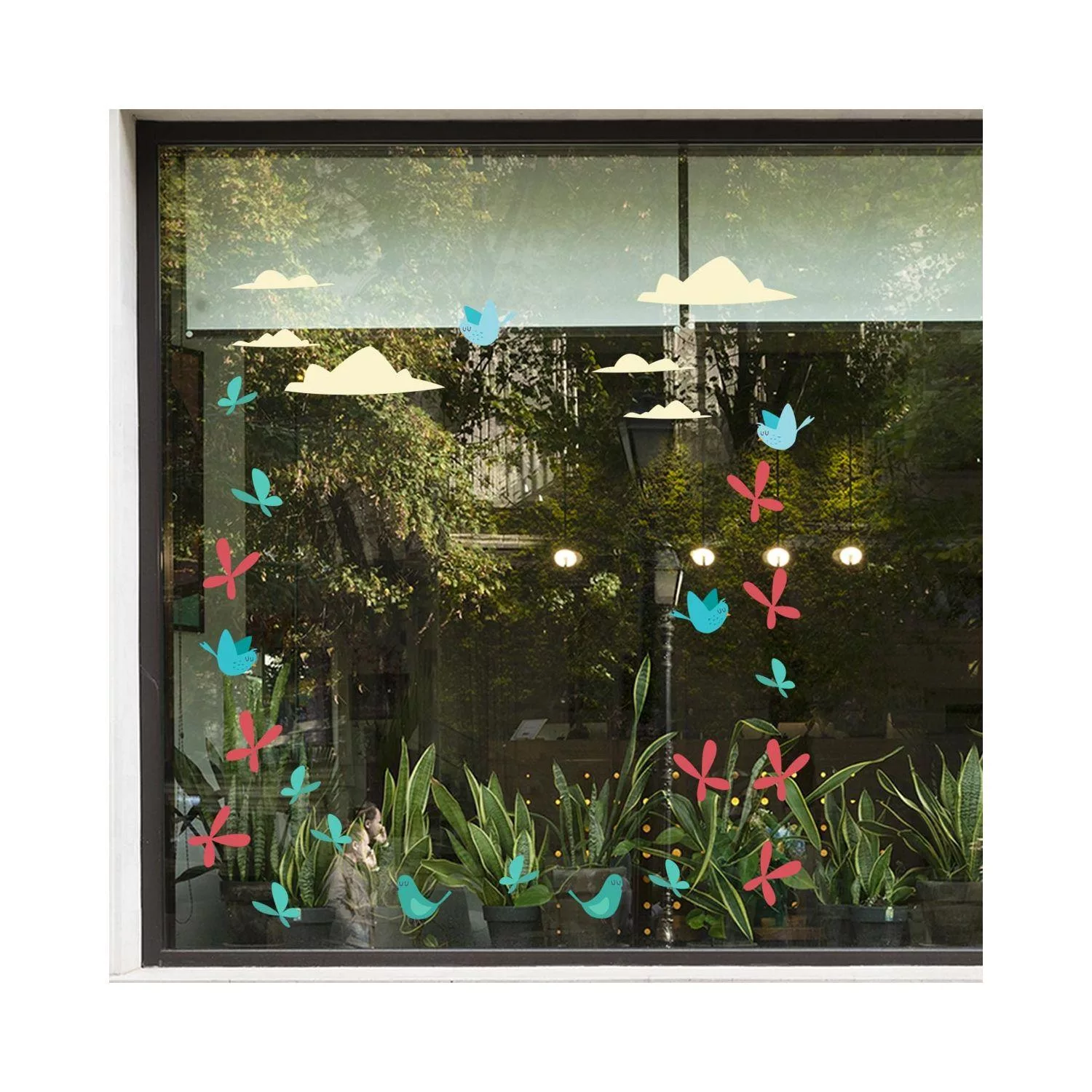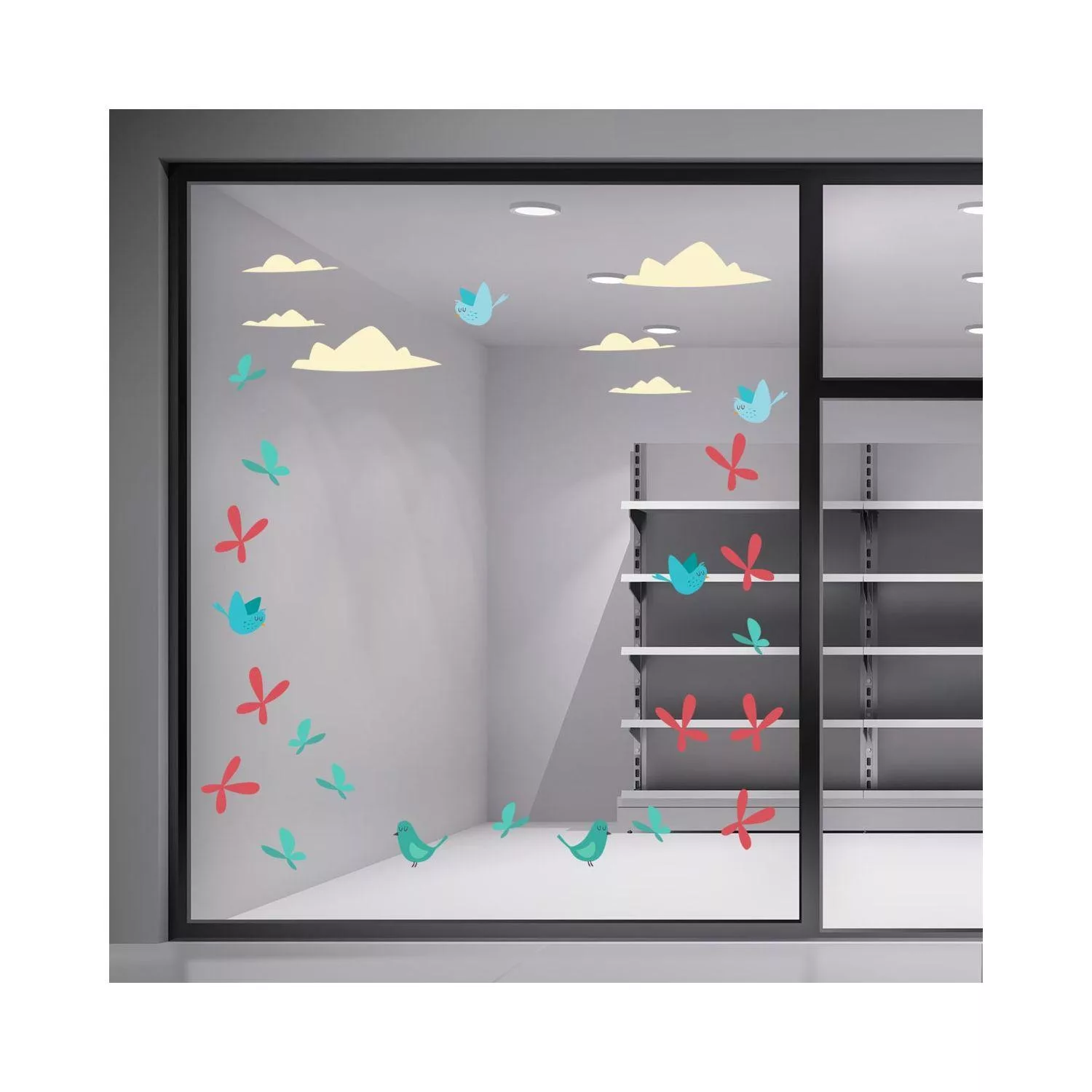 Easter shop window stickers, Spring time birds clouds and butterflies