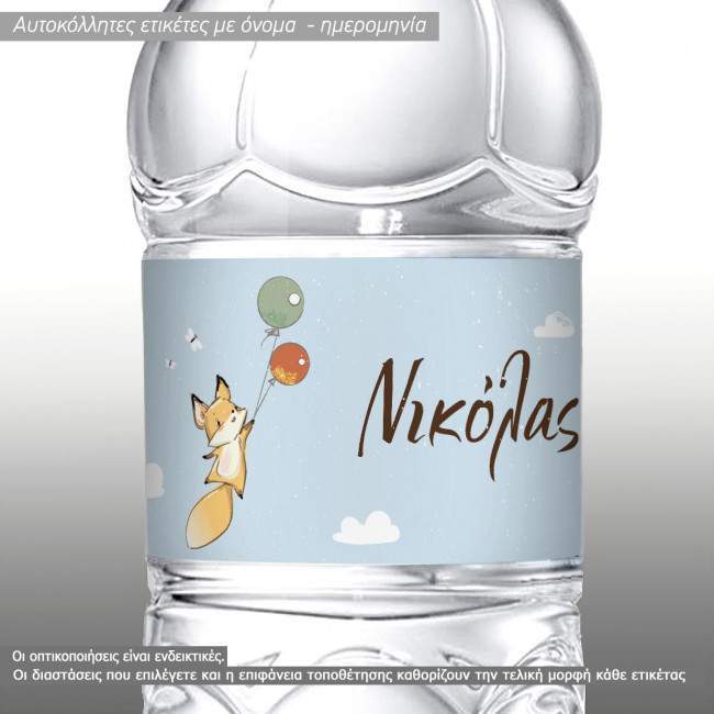 Sticker labels Fox with balloons at clouds, with name