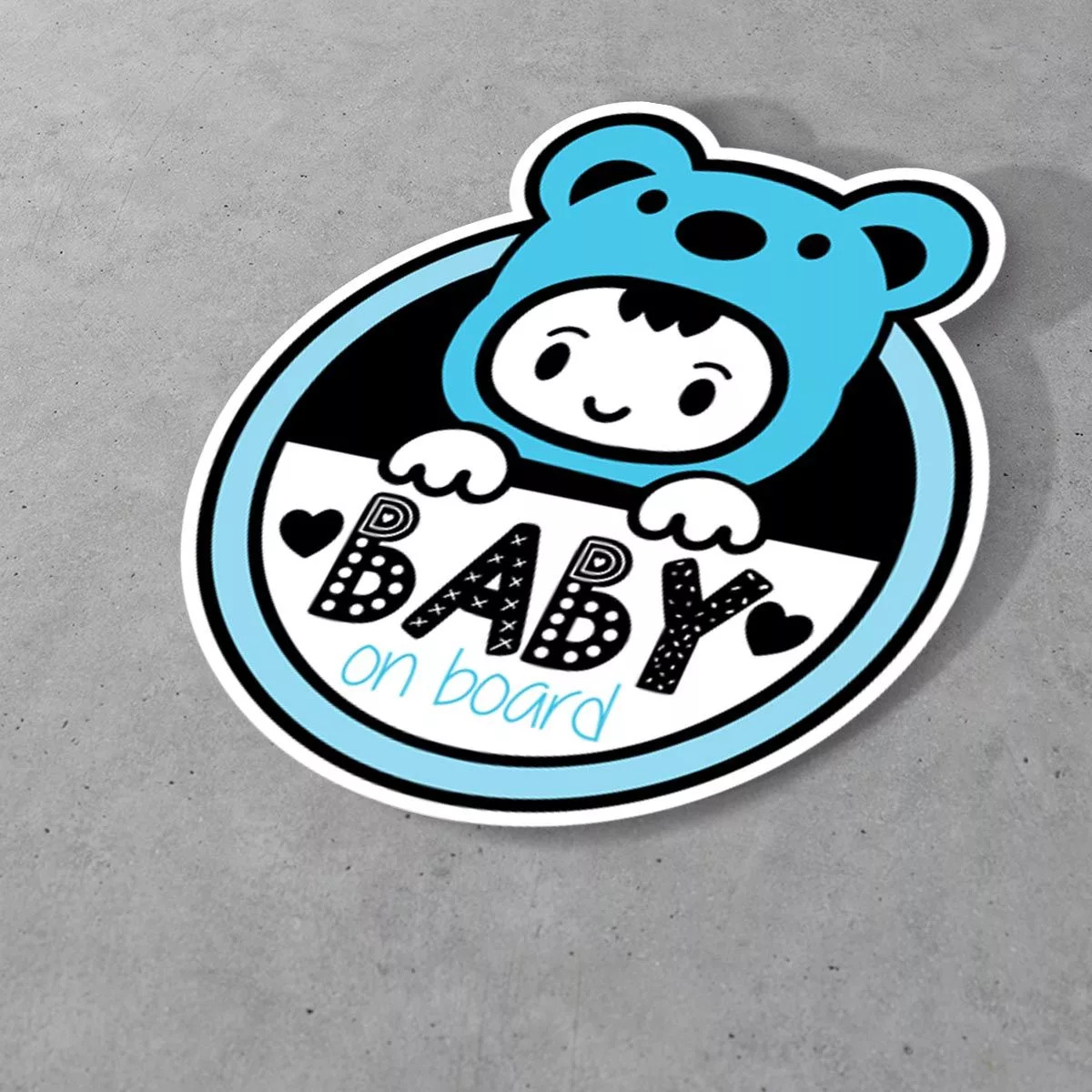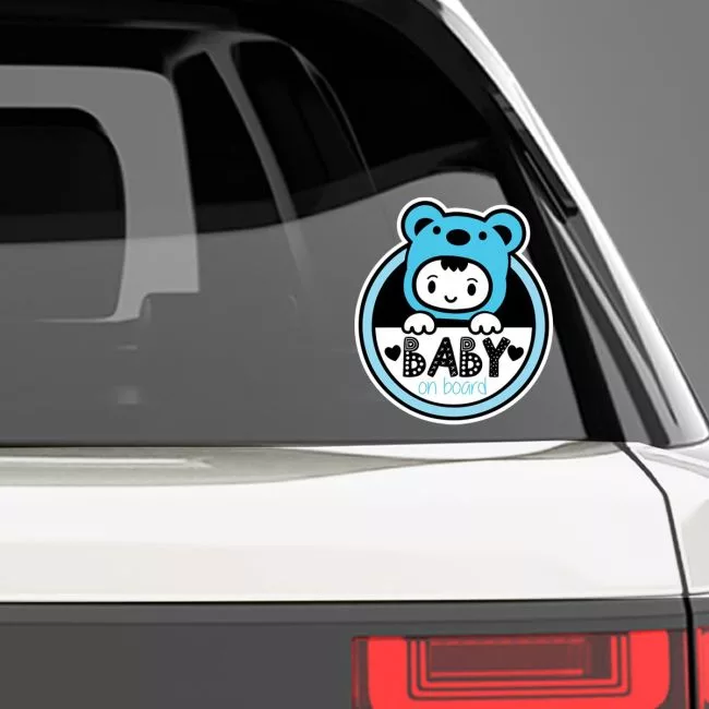 A cute "Baby on Board" car sticker featuring a baby boy in a bear suit