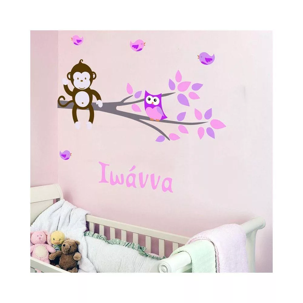 Kids wall stickers Monkey, owl and birds, Hello! (pal pink)