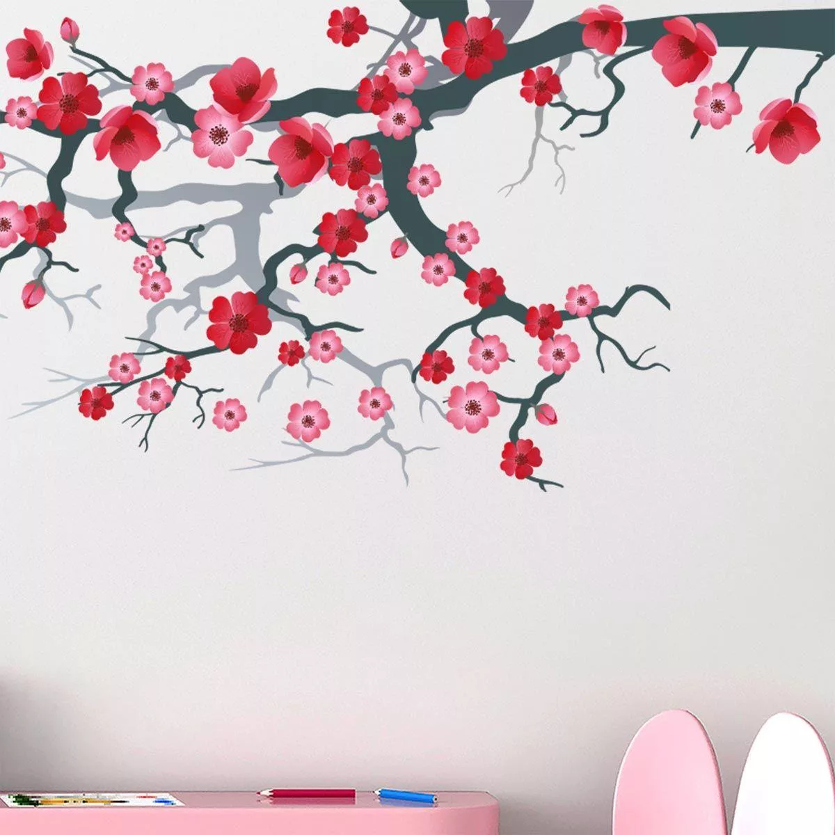 Wall stickers blooming branch, pink and red flowers. Pink blossomed branch