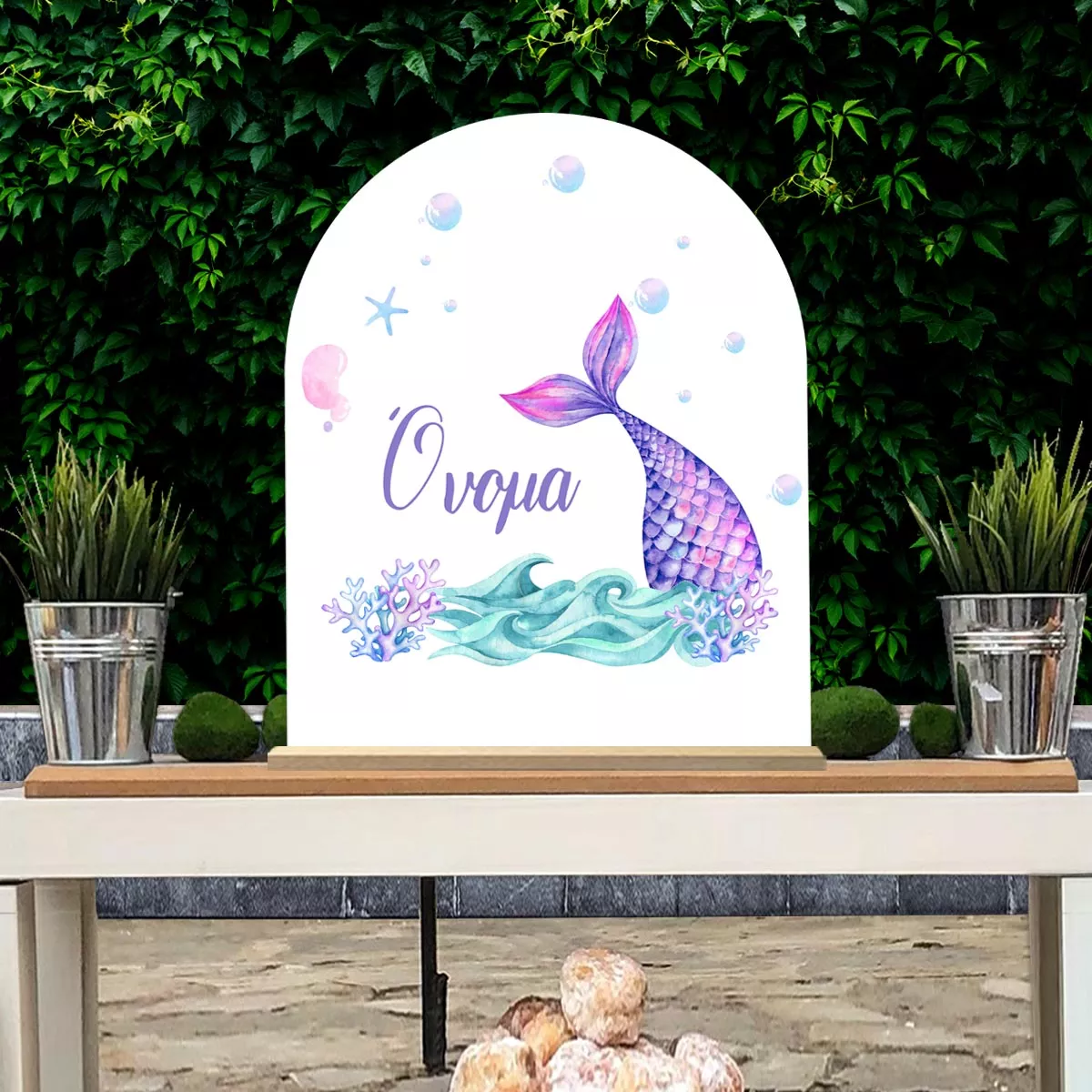 Don't forget to save your customization to be able to add to cartCreate a fairytale setting with this elegant sign depicting a mermaid's tail. Its graceful arch shape and soft, painted style bring a sense of magic and wonder to your event space, drawing attention to your buffet or dessert table.