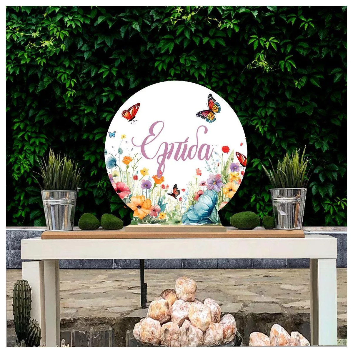 Wooden candy bar sign featuring flowers and butterflies. Personalize with a name for baptism or birthday. Perfect event decoration.
