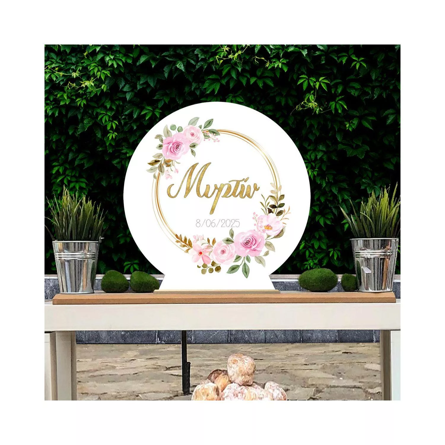 Wooden printed sign, Flowers gold circles and letters