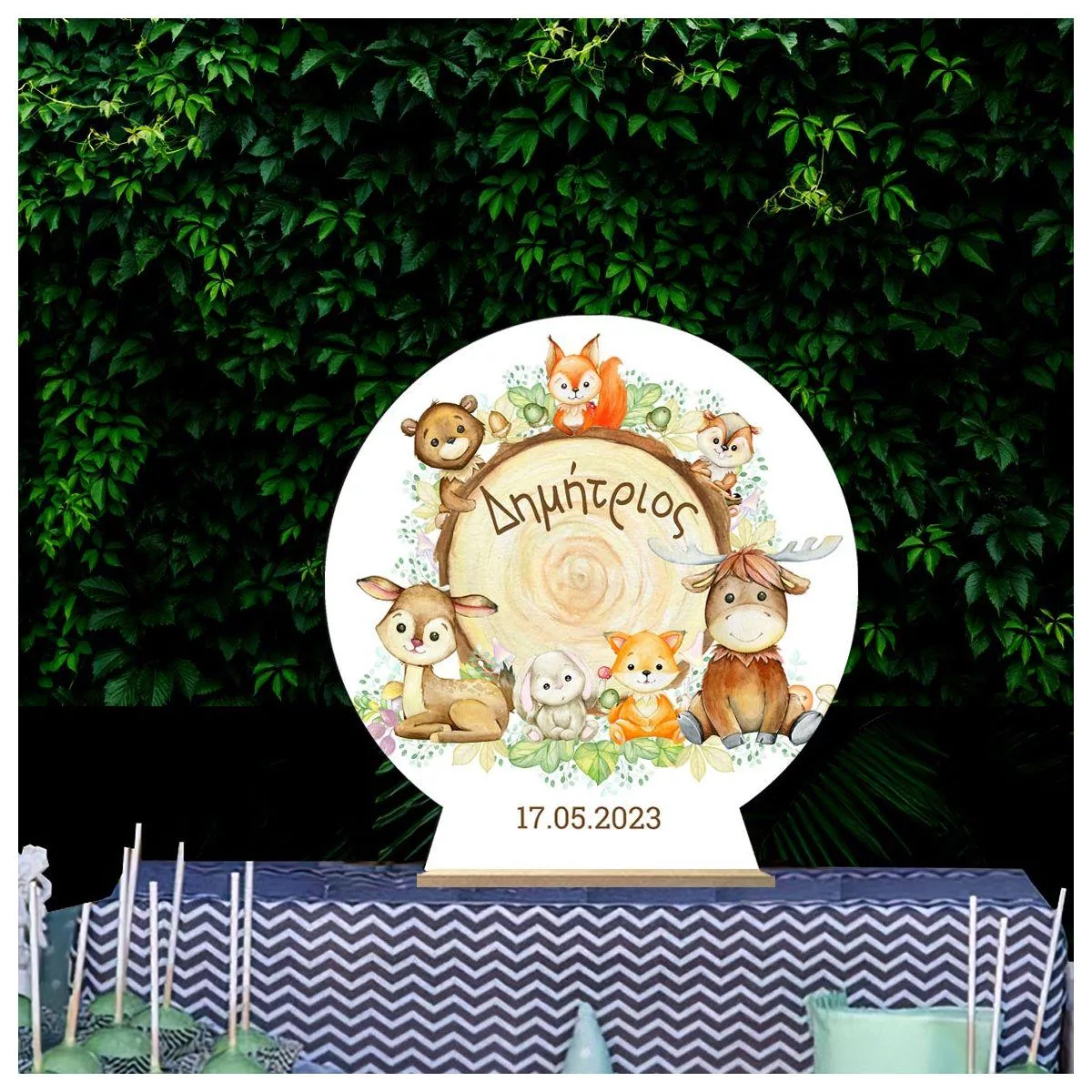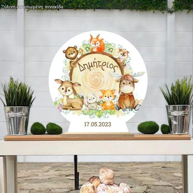 Wooden printed sign, Watercolor forest animals around tree