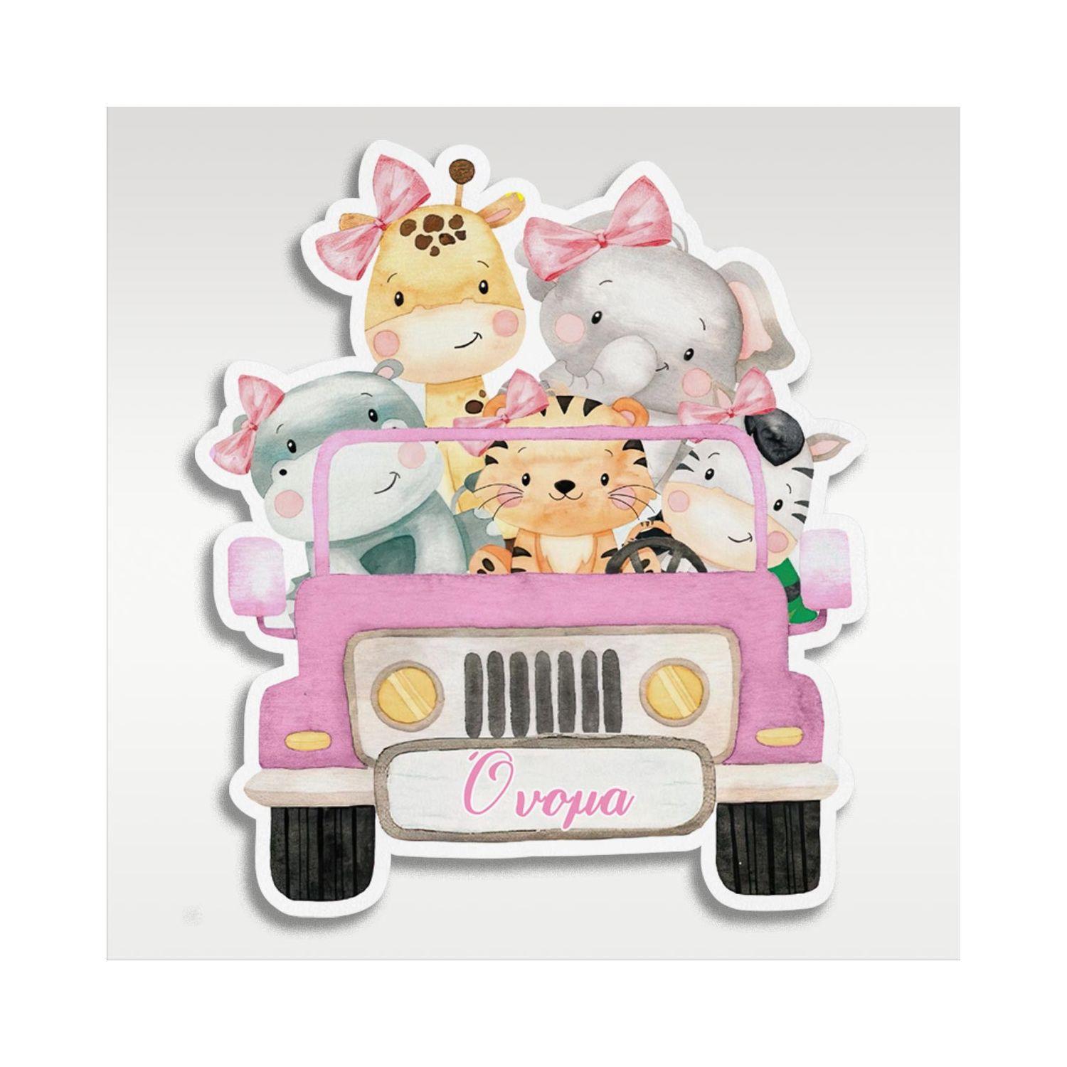 Wooden figure printed Cute pink watercolor animals Jeep tropical leaves, driving a car